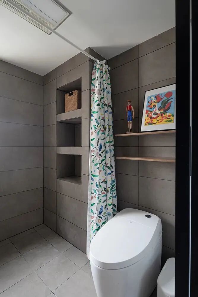 ▲卫生间内部,以浴帘为淋浴与马桶分区的空间,马桶后装了木质搁板,淋浴区里面也装了壁龛作为卫浴用品的收纳摆放,呈现出一种简约小资的个性氛围感。