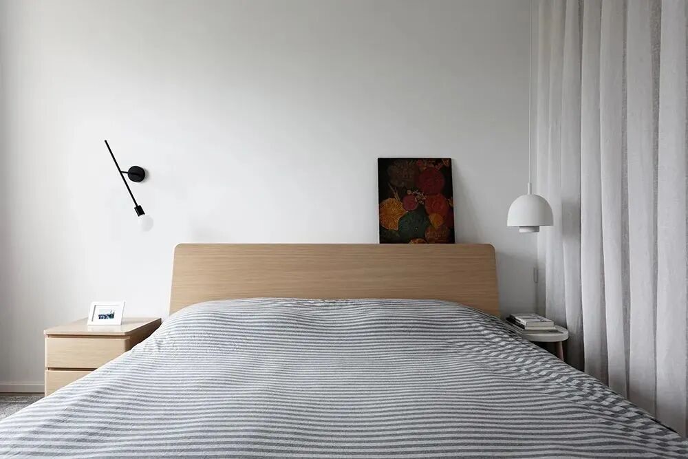 ▲主卧的墙面简洁为主,布置一张木质床铺与床头柜,床头后方靠着一幅装饰画,旁边还有一盏壁灯与床头吊灯布置,简洁的卧室空间,令人轻松而惬意。