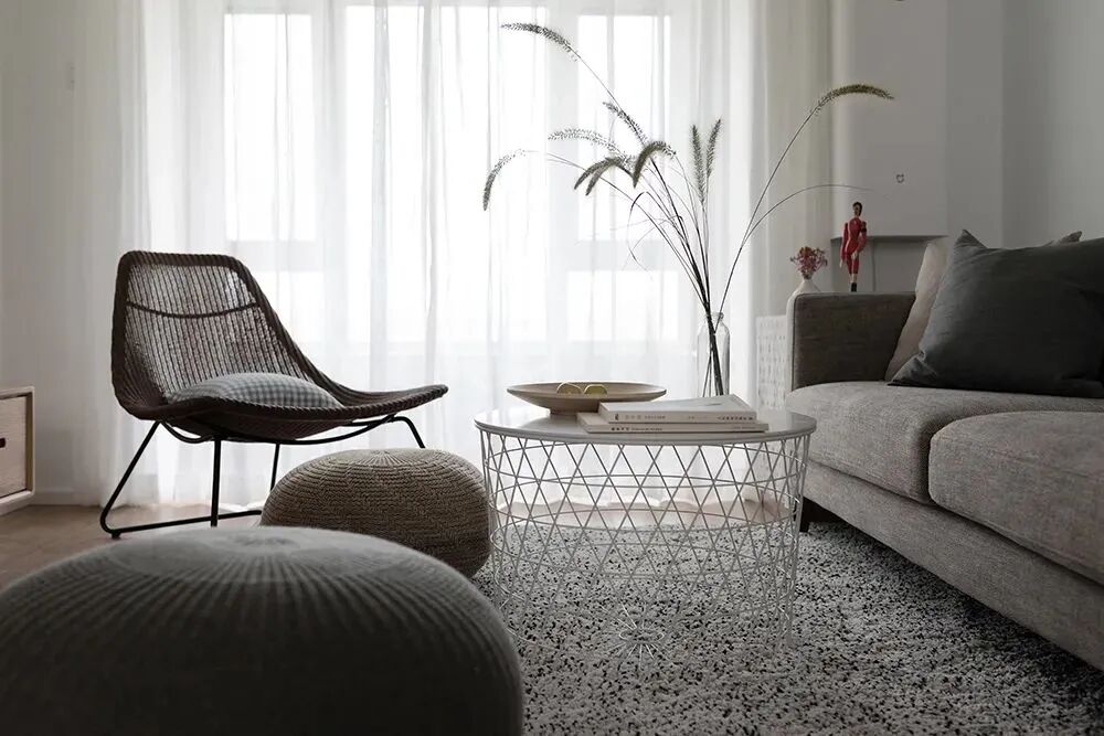 ▲简易的小茶几,还有编织的鼓凳与藤椅布置,简单布置也让空间显得干净优雅而大气。