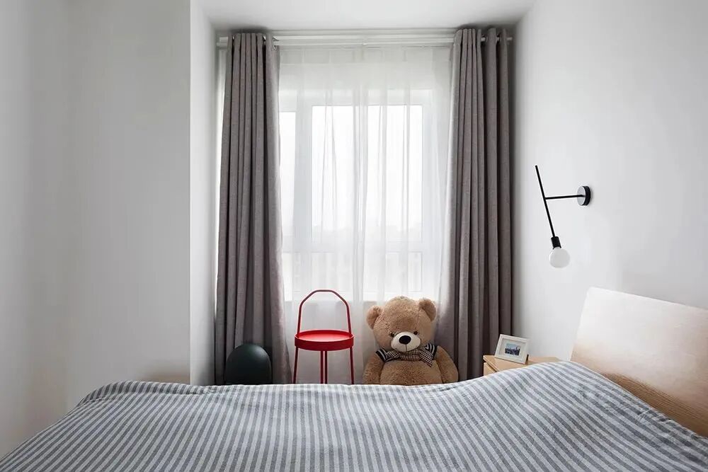 ▲靠窗布置红色便携小茶几,还有一个大雄抱枕,布置灰色窗帘,带来的是一种简约优雅的时尚空间感。