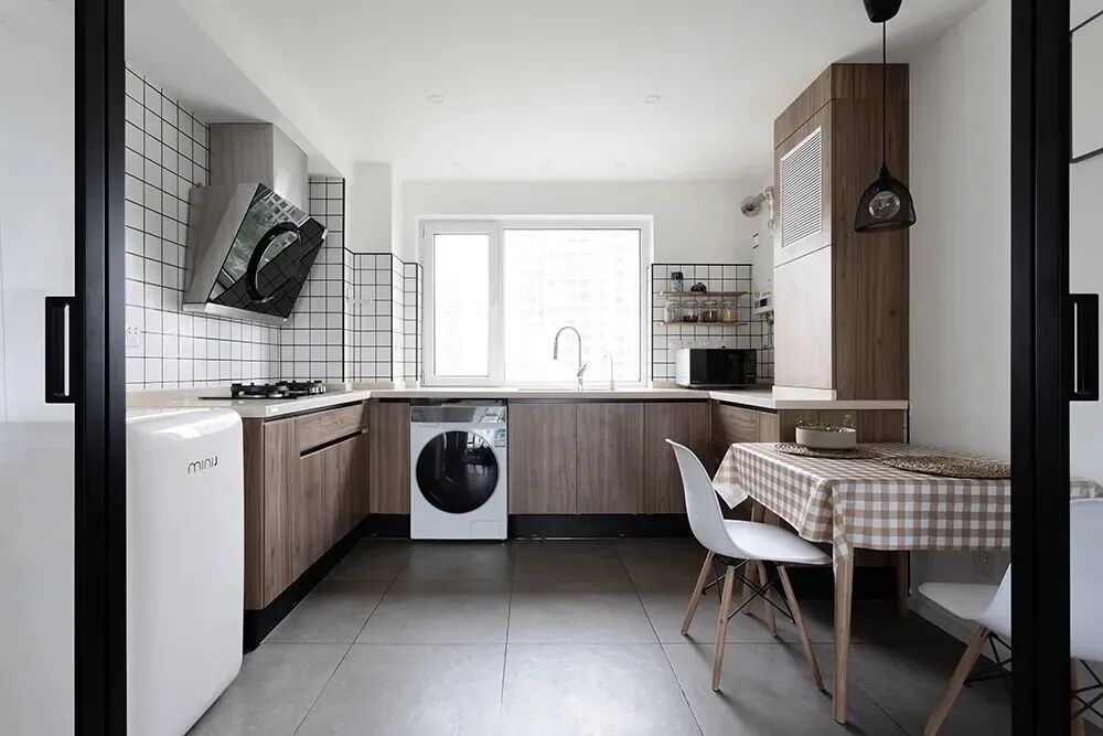 ▲厨房与餐厅做成一体的空间,以黑色推拉门隔断,让这个空间成为开放与封闭之间灵活的空间。U字形的木质橱柜操作台,结合白色小格砖的搭配,洗衣机也嵌到橱柜中间,整体空间虽小,但在巧妙合理的利用下,也是显得更加优雅精致。