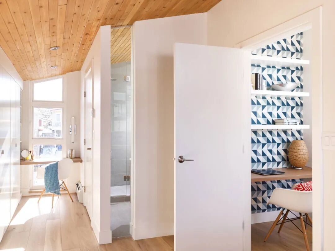 木地板于不同区域的构筑,灵活多变、趣意盎然,清晰的木纹肌理顺着光影的方向,纵横叠加,通透与纯净交织,引人入胜。