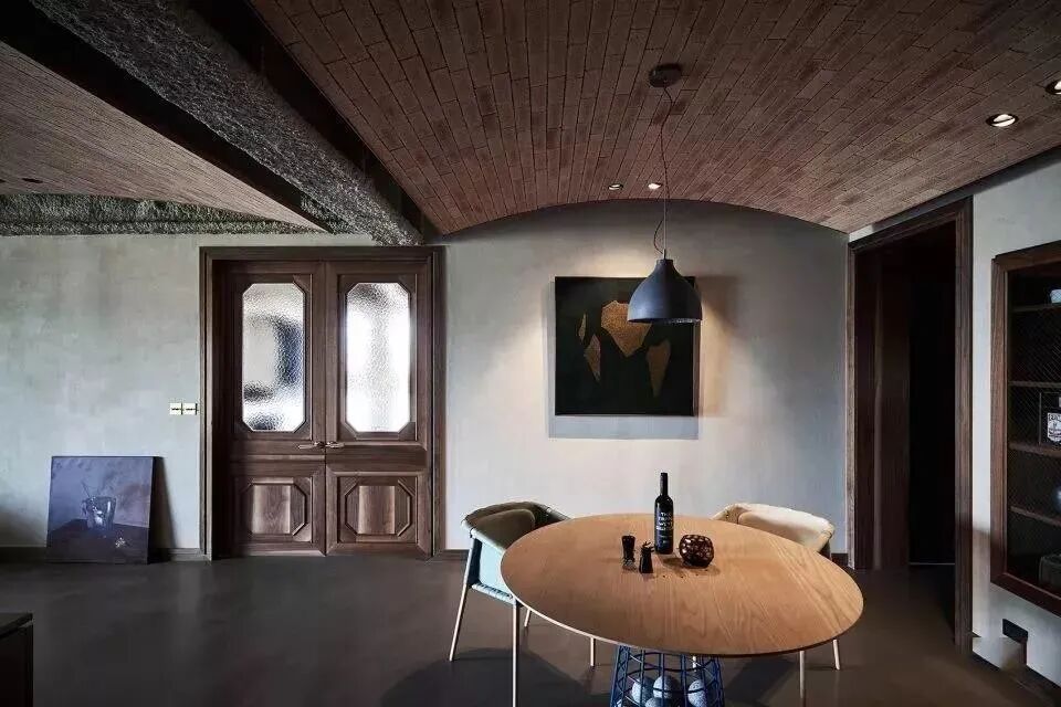 一眼到底的开阔大空间,在推开门的瞬间便立刻让人倍感惊艳。复古造型的沉重木门,胡桃木地板,以及门口两侧的棕色系画作,不仅处处起到装饰的作用。一种复古的情绪感瞬间充斥在空间之中。