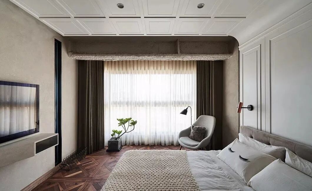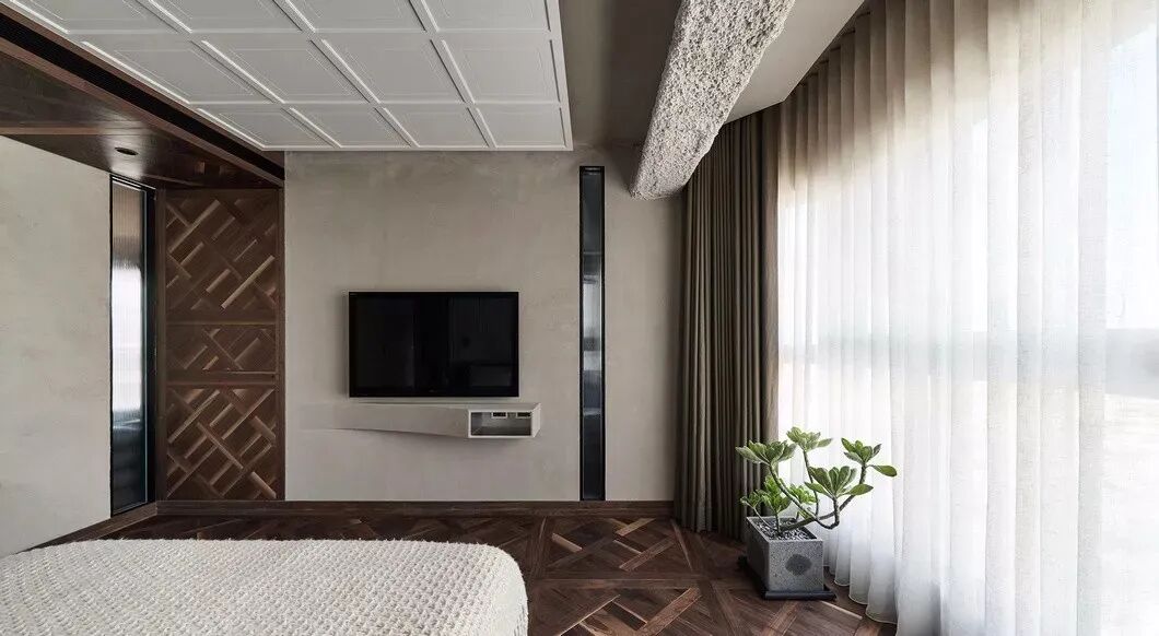 天花板的材料使用格外巧妙,再加上地板延续到门板及天花的惊艳设计,让整个卧室在充满温馨与简洁的同时,还有更多的视觉丰富性。包括在角落里放置一盆绿色植物,不得不说,一抹跳脱的绿色,让空间顿时生机勃勃。