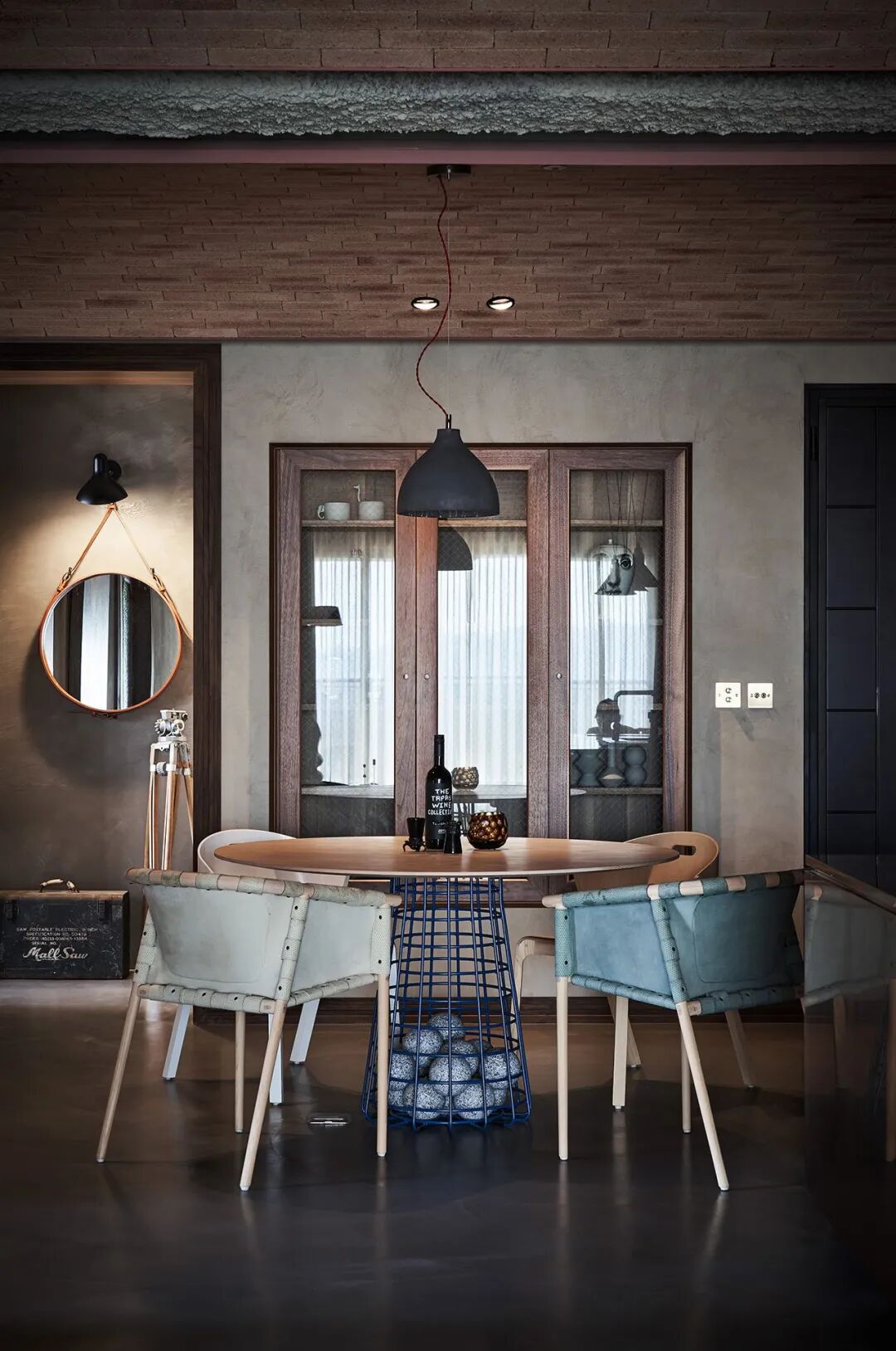 玻璃窗上下简单镶嵌木框,区别于墙体、地面以及天花板较为复古的材质使用,家具的选用则是科技感十足。