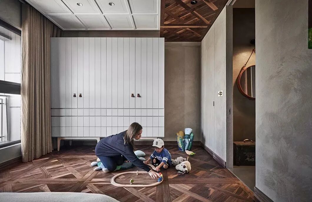 儿童房同样延续装饰主题,但装饰的小细节,几个玩偶以及秋千等,处处显示显示着幽默又玩趣的童真风格。或粗粝,或光泽的不同材料质感,仿佛构建出一个穿越时间的童趣空间,它将自己的童年与孩子的童年合而为一。
