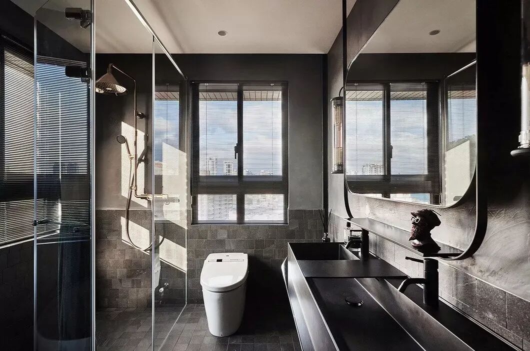 同样美到爆的还有卫生间,用全灰色调装饰卫生间并不少见。但大面积通透的玻璃与泛着光泽的金属材料,让光线充满空间,最大限度的营造出空间的通透感与开阔性。