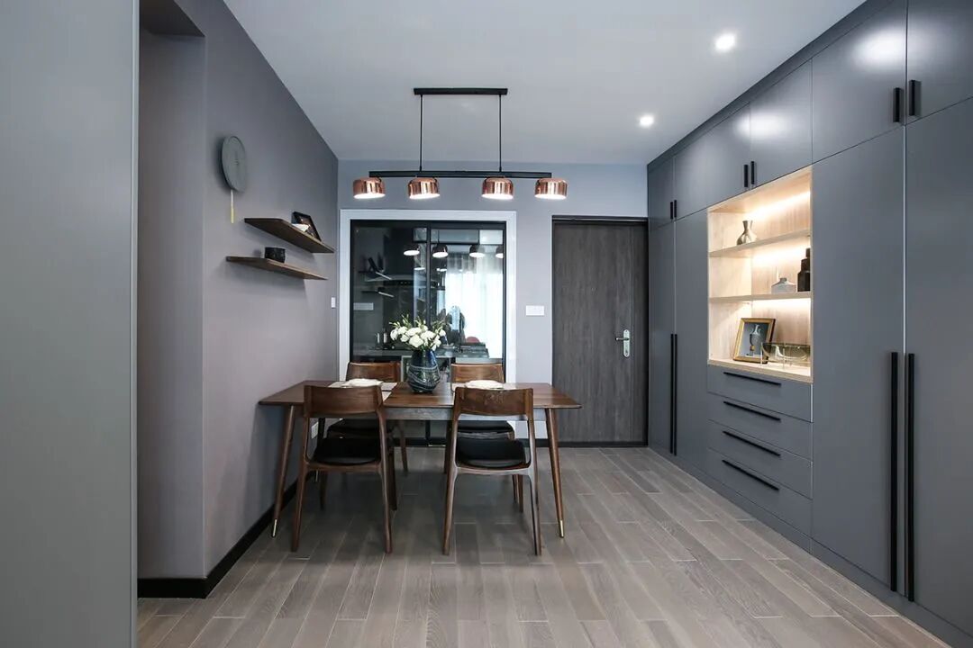 复古的木质餐桌椅到灰色调的背景,金属质感的吊灯,整个餐厅看起来非常有格调感。在餐桌椅侧方加上隔板的设计,增强储物能力。