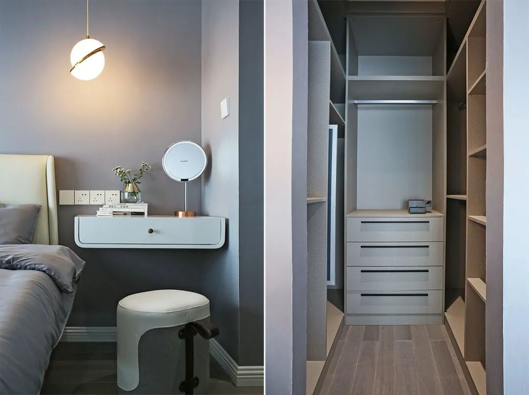 在主卧室里还有一个迷你的衣帽间,U字形布局的柜子把角落空间充分用上。衣帽间外的床头柜改成了梳妆台,使用起来更加方便。