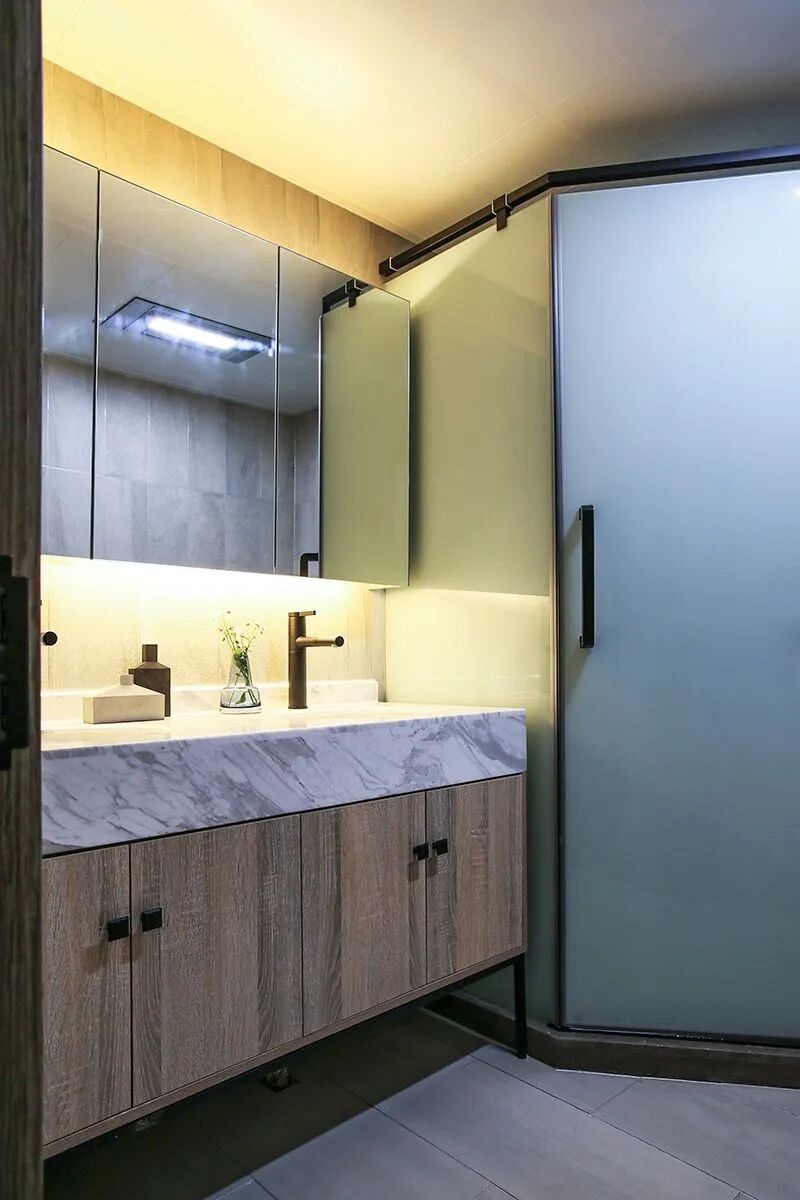 卫生间内部是三角形的布局方案,钻石形的淋浴房做在了转角处,两侧摆放洗手台和马桶。洗手台上方的镜柜做了藏光的设计,看起来更时尚。