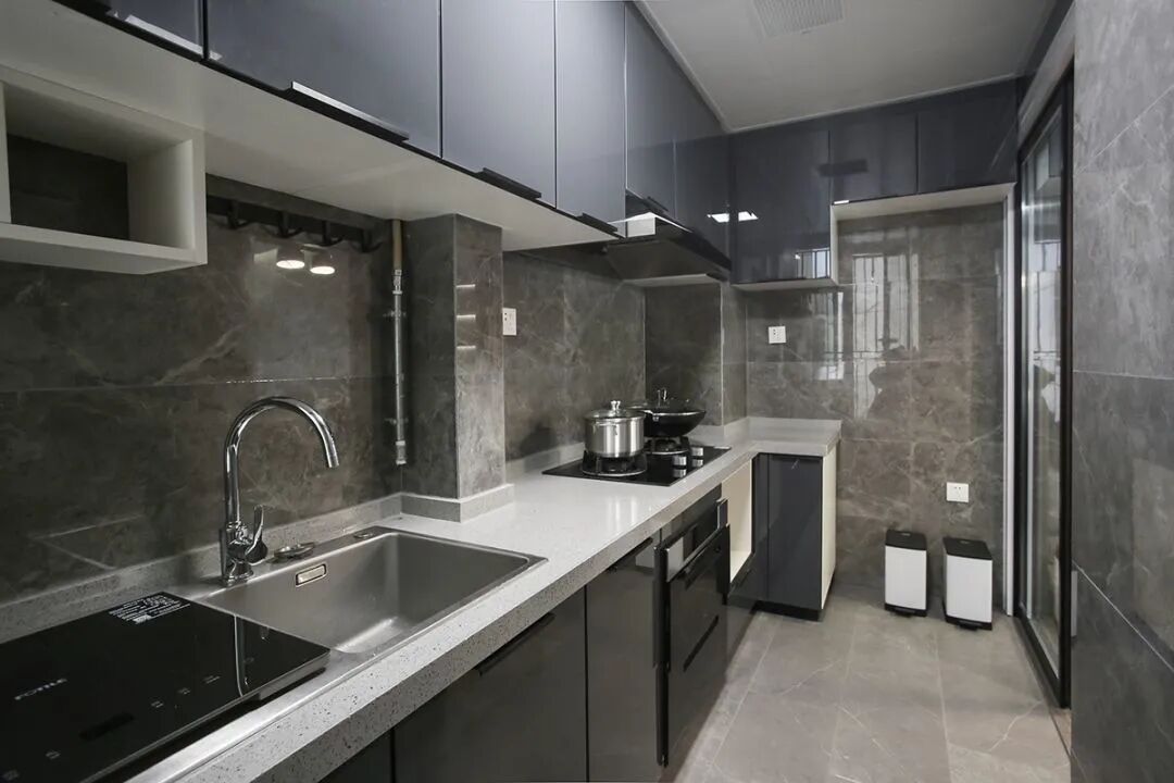 厨房内部的橱柜延续了客餐厅的柜子颜色,深灰色的大理石墙砖搭配灰色的哑光地砖,整个厨房看起来很有现代感。