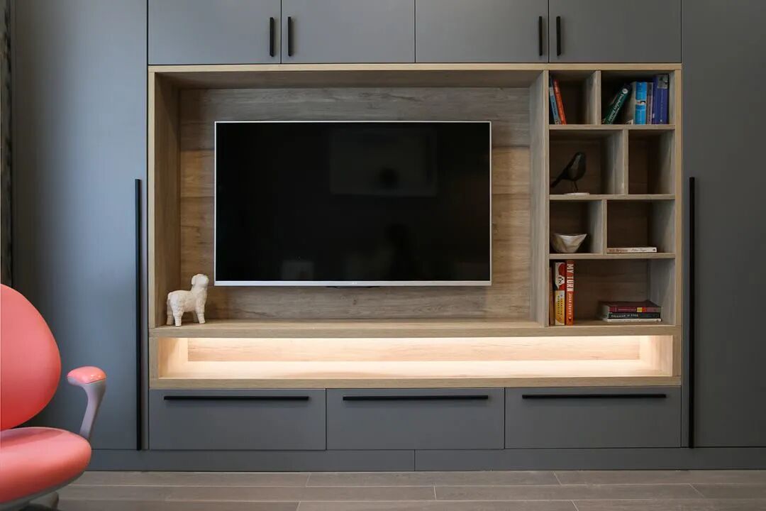 客厅的电视背景墙则是被利用起来做了收纳,整墙的柜子留空电视周边的部分区域,加上藏光之后使用更方便,看起来也更大气。