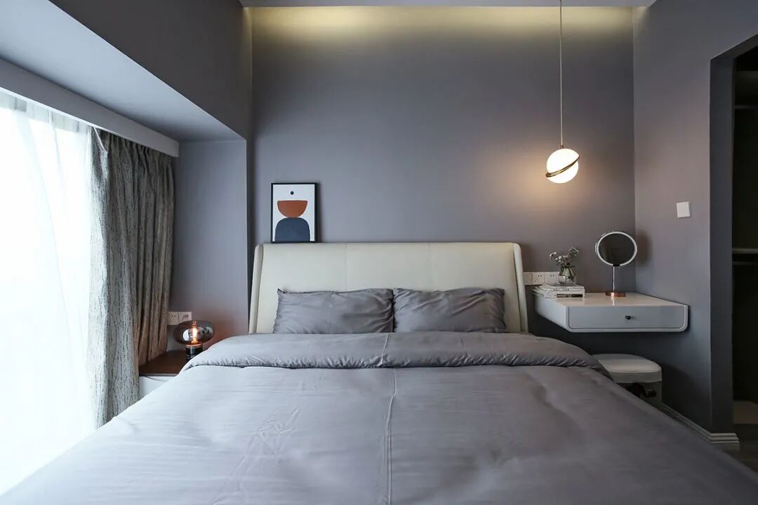 卧室选择了以蓝灰色为主,在卧室顶部吊顶内加上藏光,用吊灯、台灯等代替主灯,让卧室看起来更为简洁。