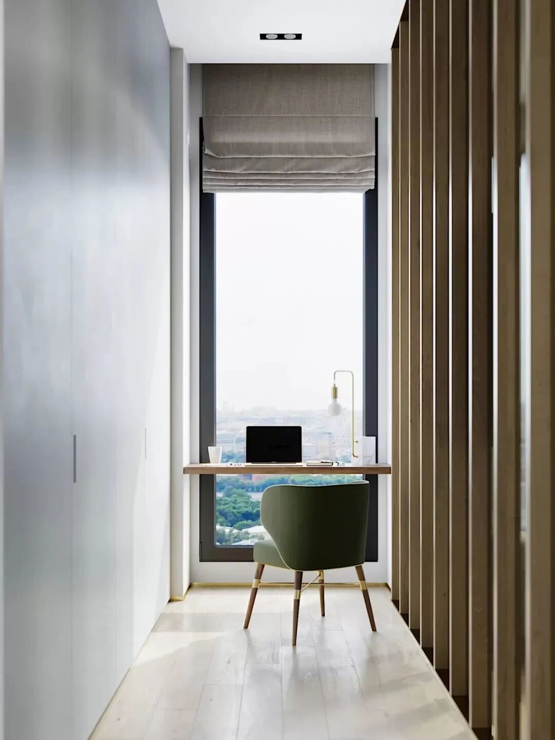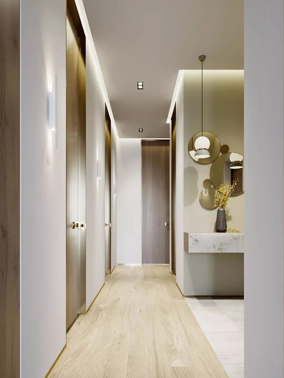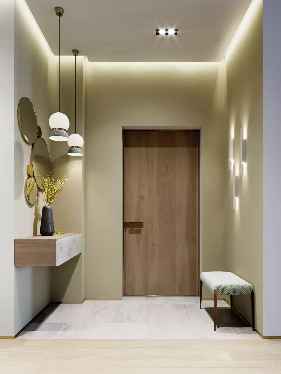 入口处的设计得十分简约,以灰绿色奠定自然的基调,镜面装饰则增加时尚感,并通过光线的晕染,让小空间也充满层次感。
