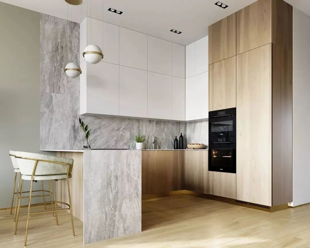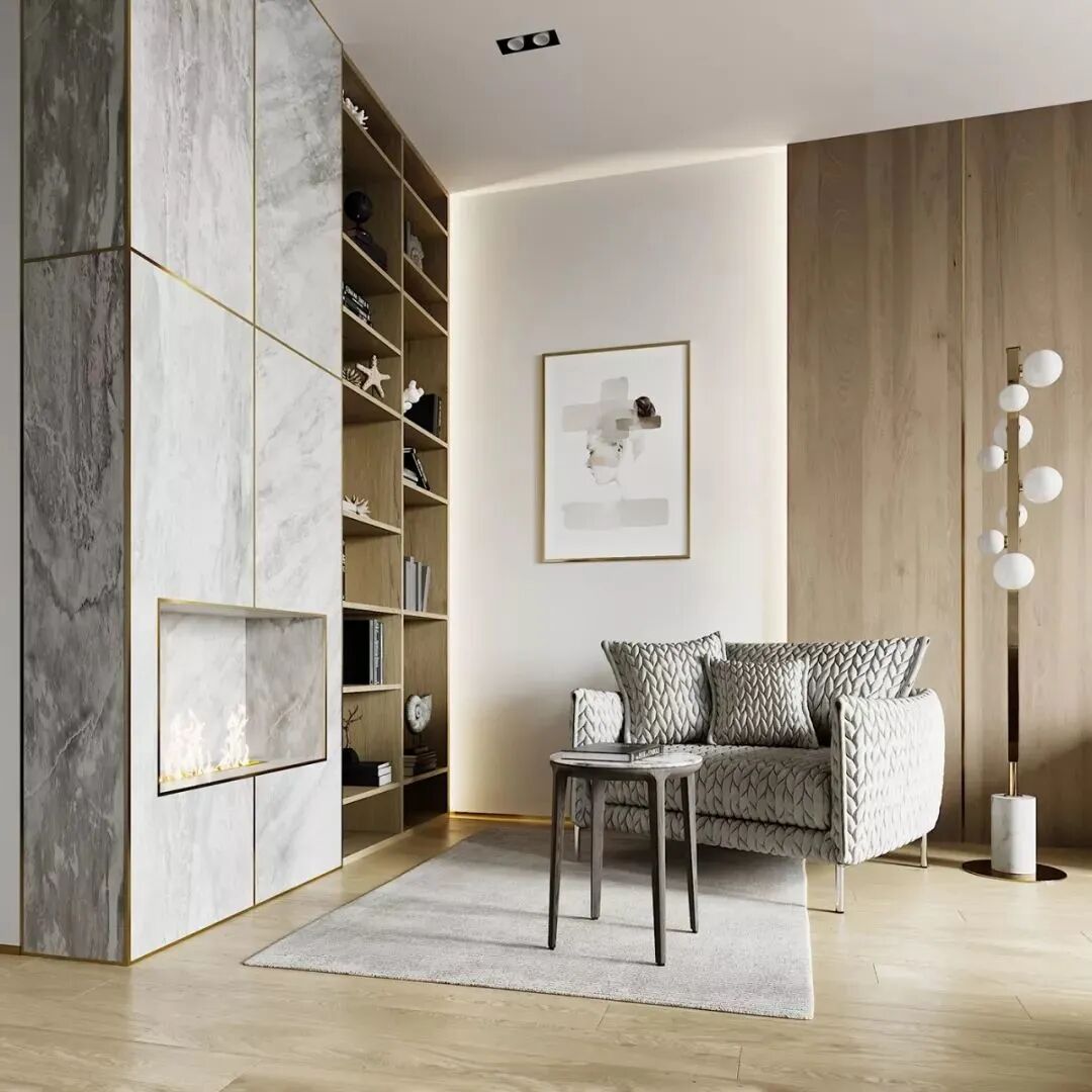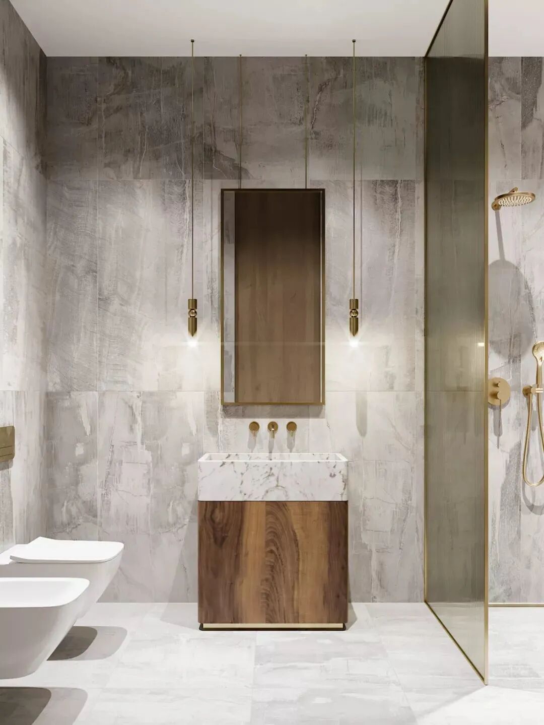 室内运用了大量的天然材质,木元素温暖、柔和的属性,在光线下发挥到最佳状态。在色彩上,加入了极具包容感的灰色调与华丽的黄铜、大理石元素,让空间拥有丰富的视觉效果。