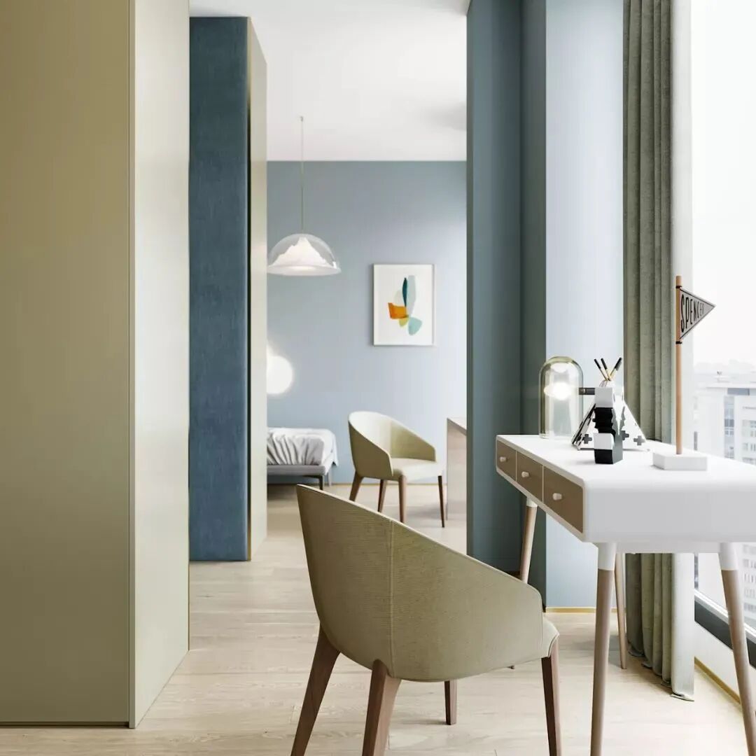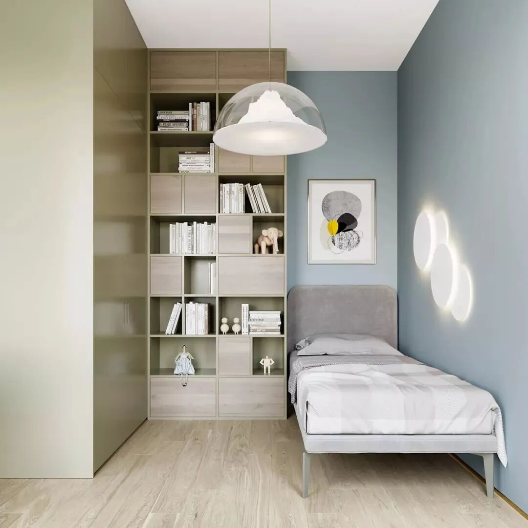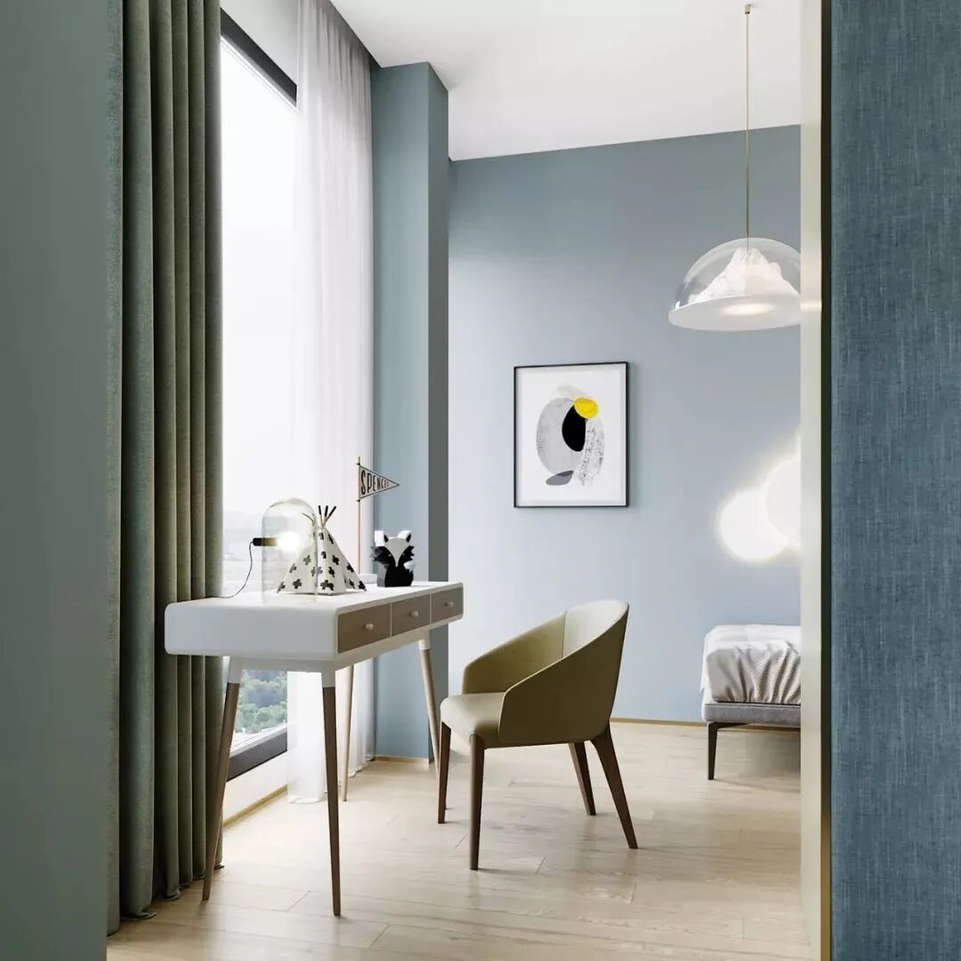 儿童房选用蓝色调作为基底,代表了孩子的天真与活力。空灵的白色吊灯,给孩子带来梦幻的视觉享受。