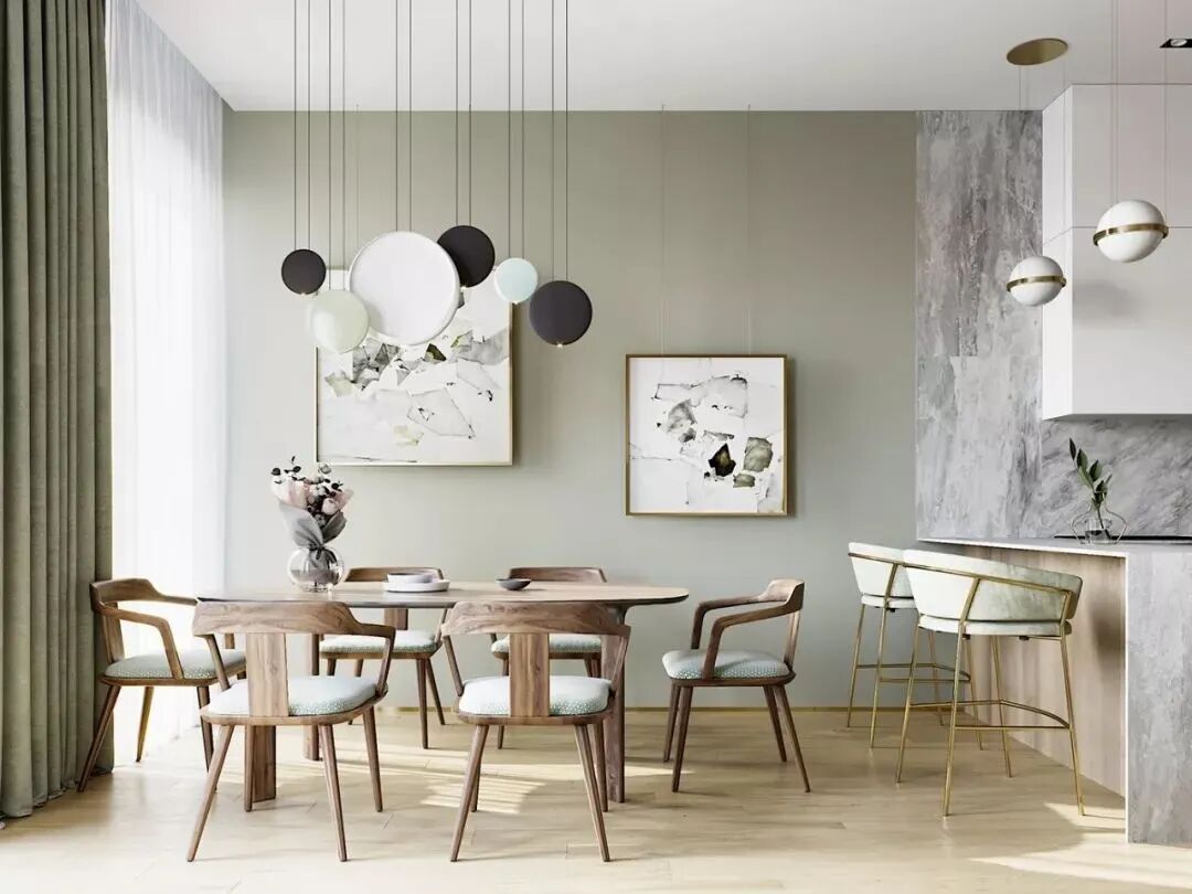 餐厅不规则的艺术吊灯彰显出屋主高雅的艺术品位,同时设计师也十分注重空间的功能性,多处定制的柜体满足储物需求。