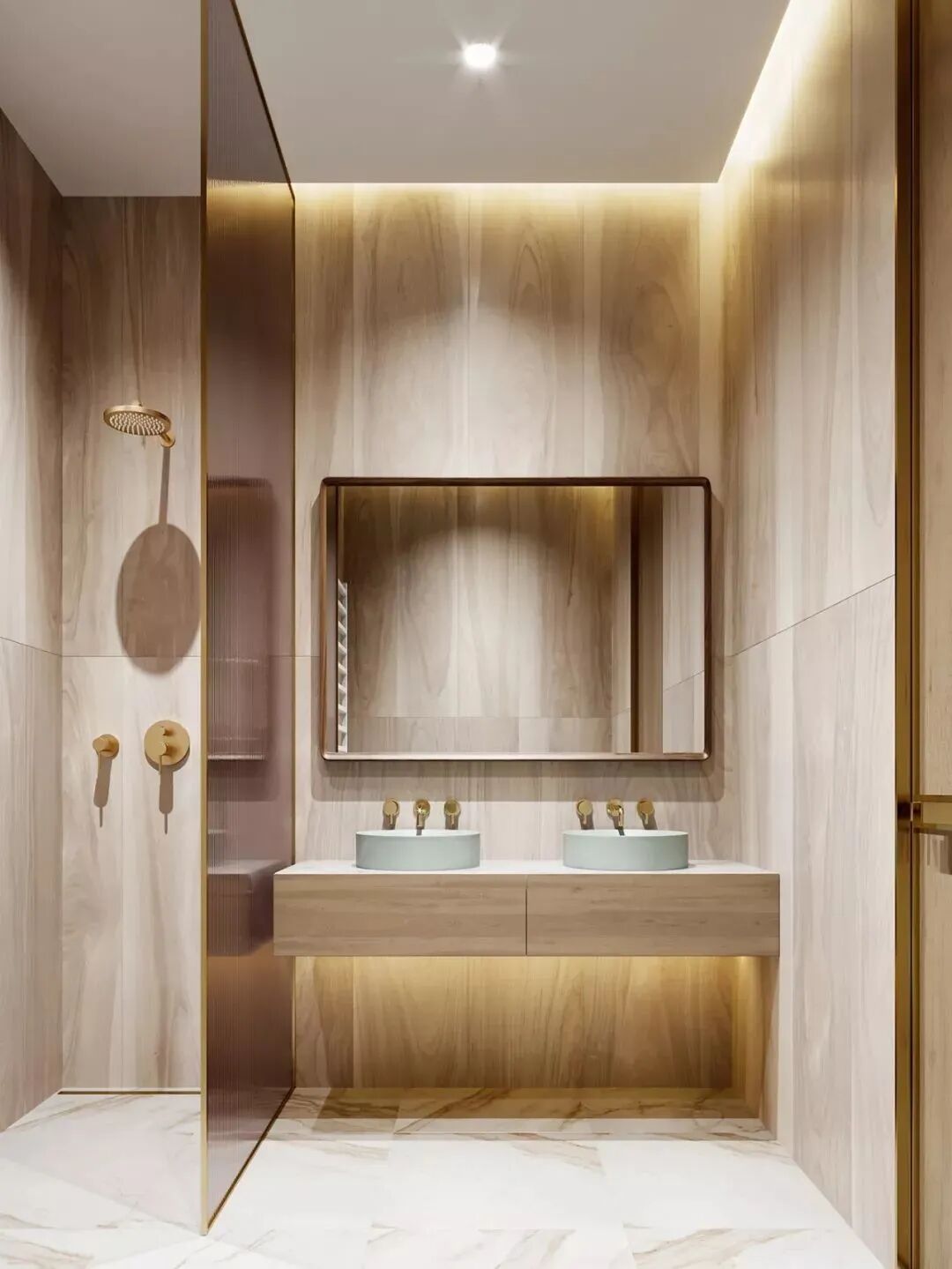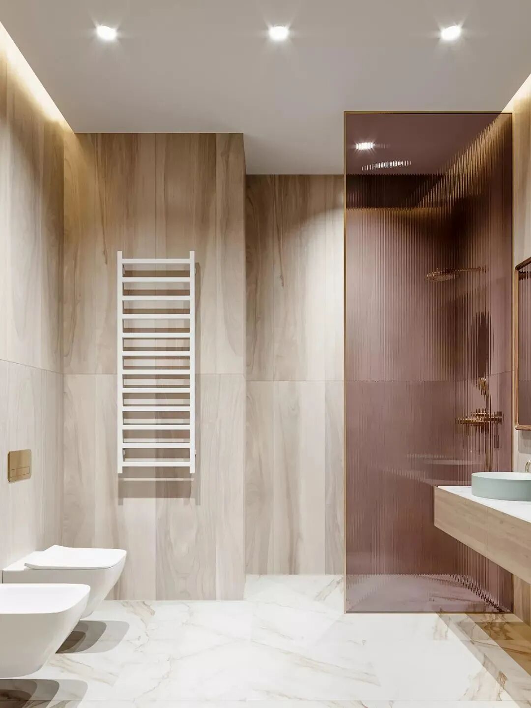 次卫空间整体采用木纹砖系列,搭配淡紫色的玻璃隔断,让整个空间充满了自然、通透的感觉。