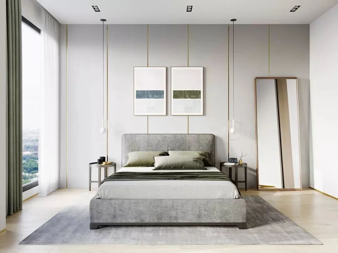 卧室无需过多的点缀,利落的线条与简约的装饰画,在灰色调的搭配下,营造出温暖、静谧的气息。