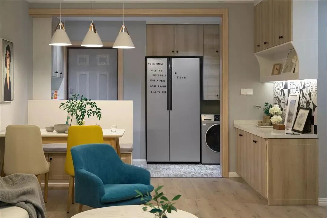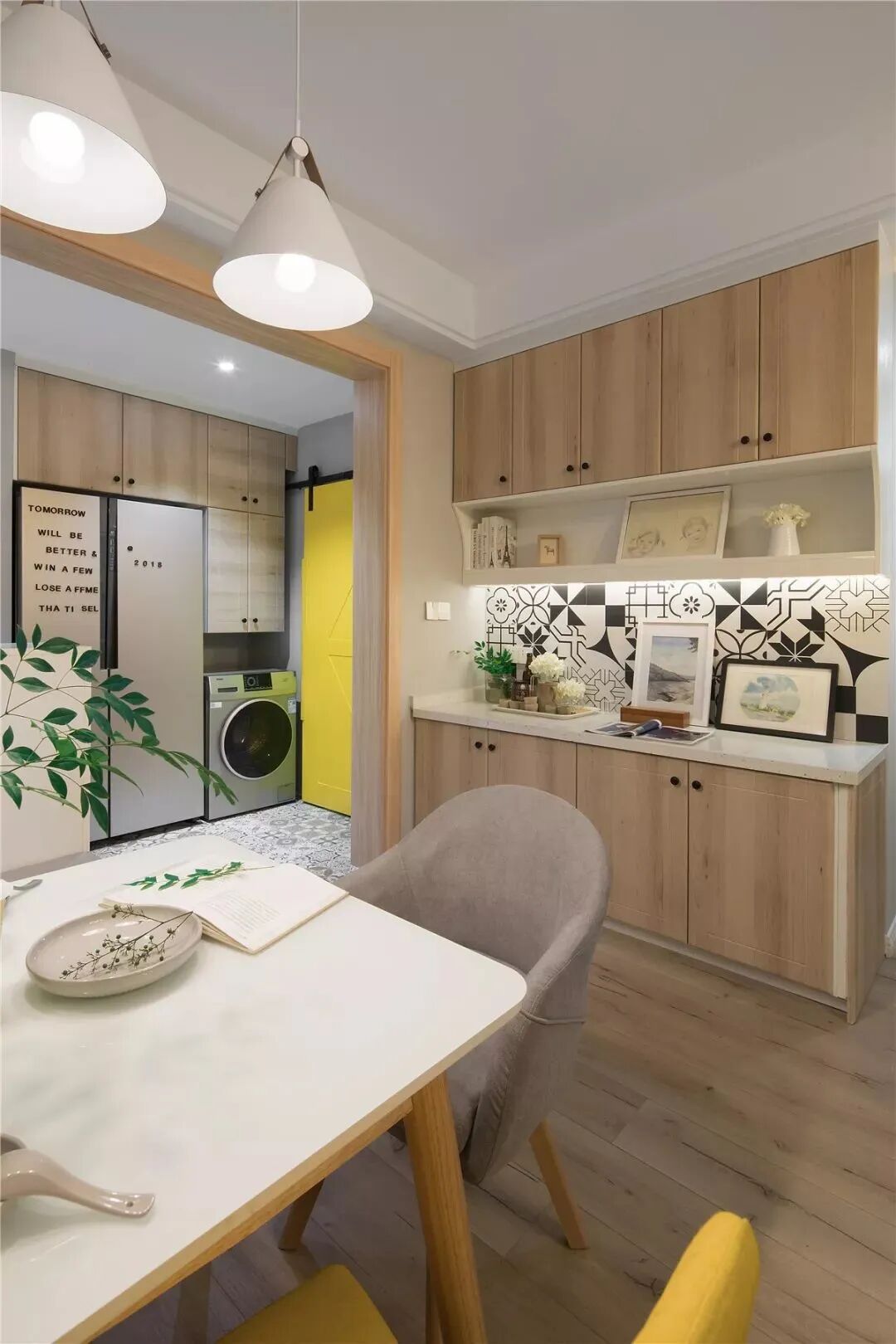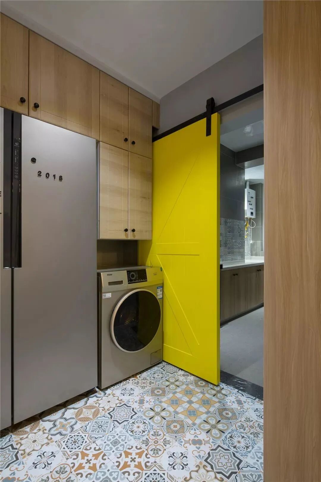 入门的另外一端连接着厨房,为了合理利用每一寸空间,在厨房的门口一排定制的柜子,将冰箱和洗衣机完美的嵌入,黄色谷仓门不仅起到分割空间的作用,更是空间的装饰亮点。