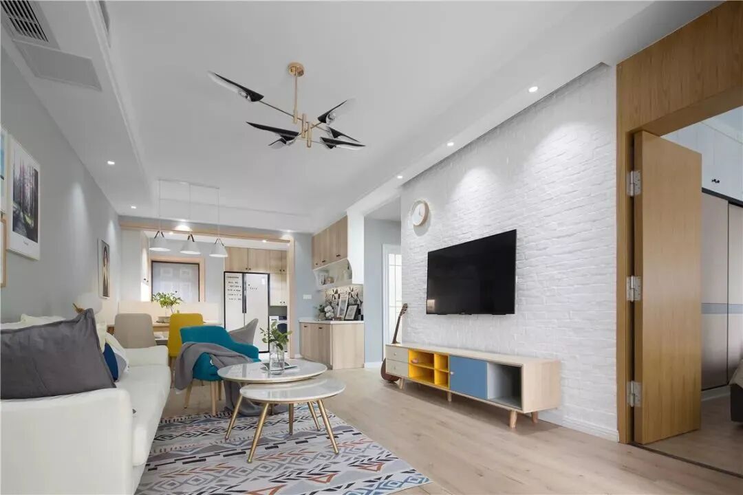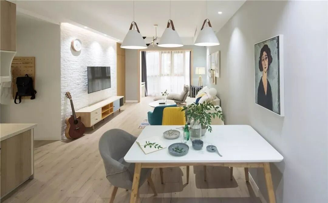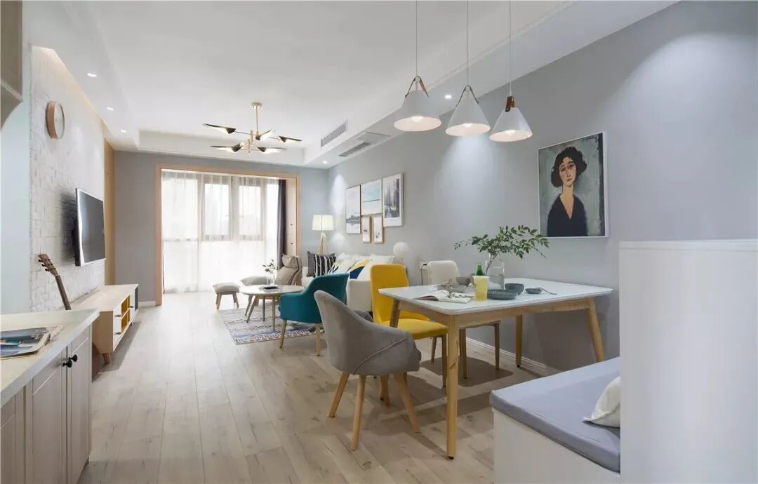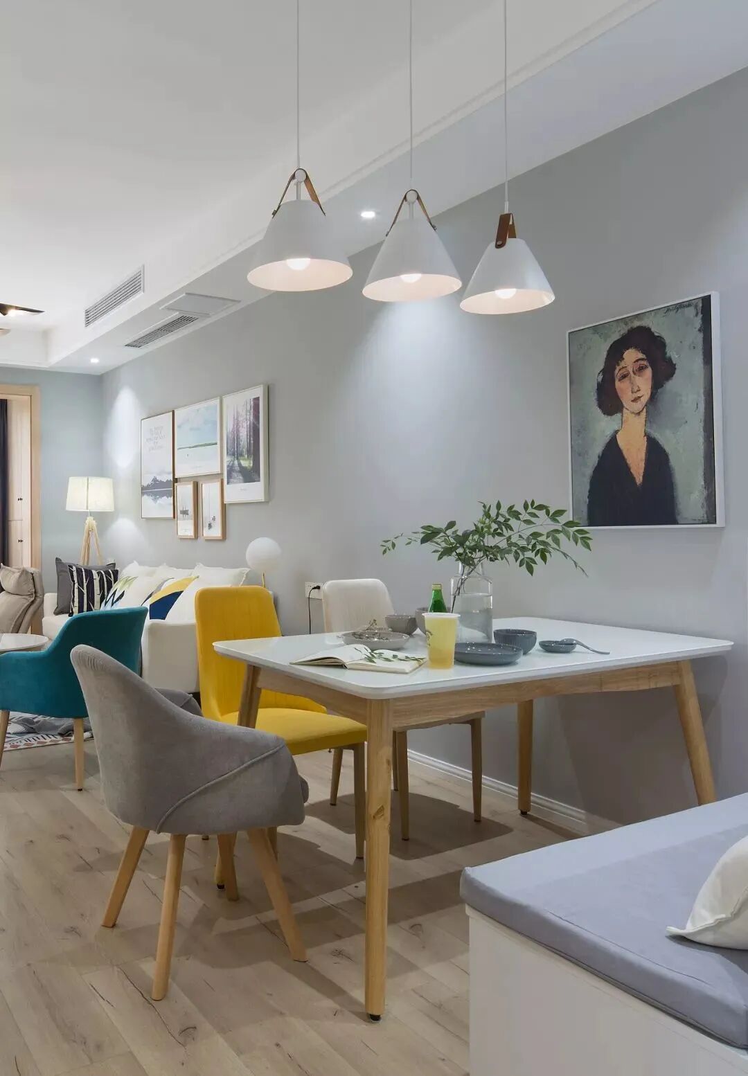 客餐厅一体化的设计,让整个空间显得更宽敞、明亮,空气流通性也好。沙发背景墙的浅灰色与顶面形成色差,体现了北欧的温馨感,做到了到家就要放松的生活状况,让生活与工作分开来更好的享受生活。