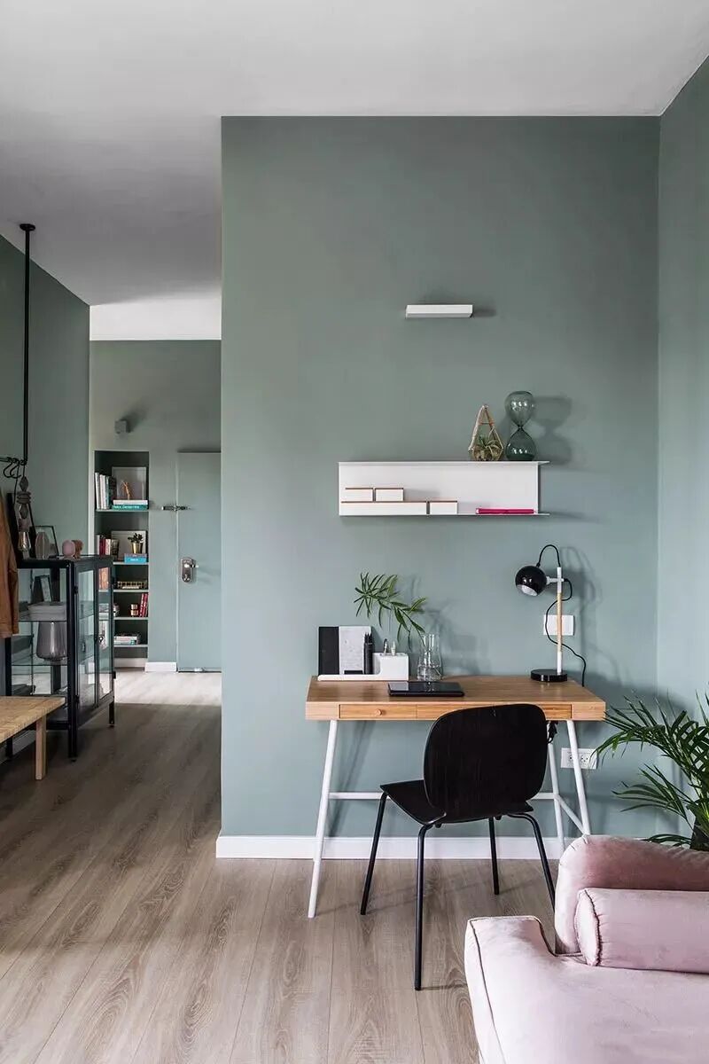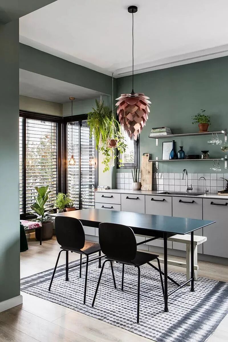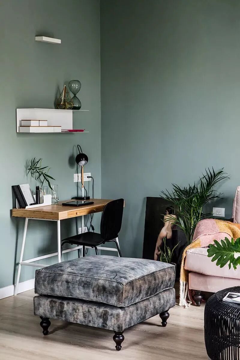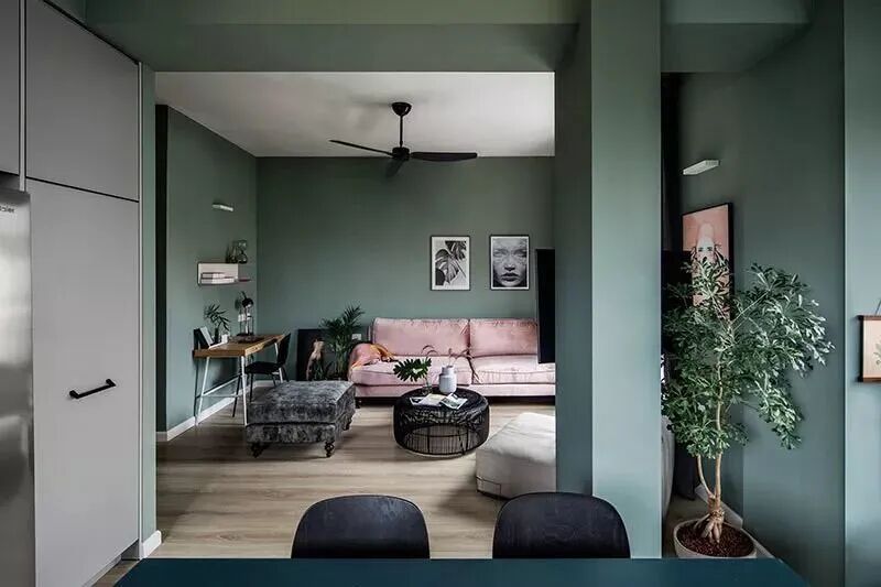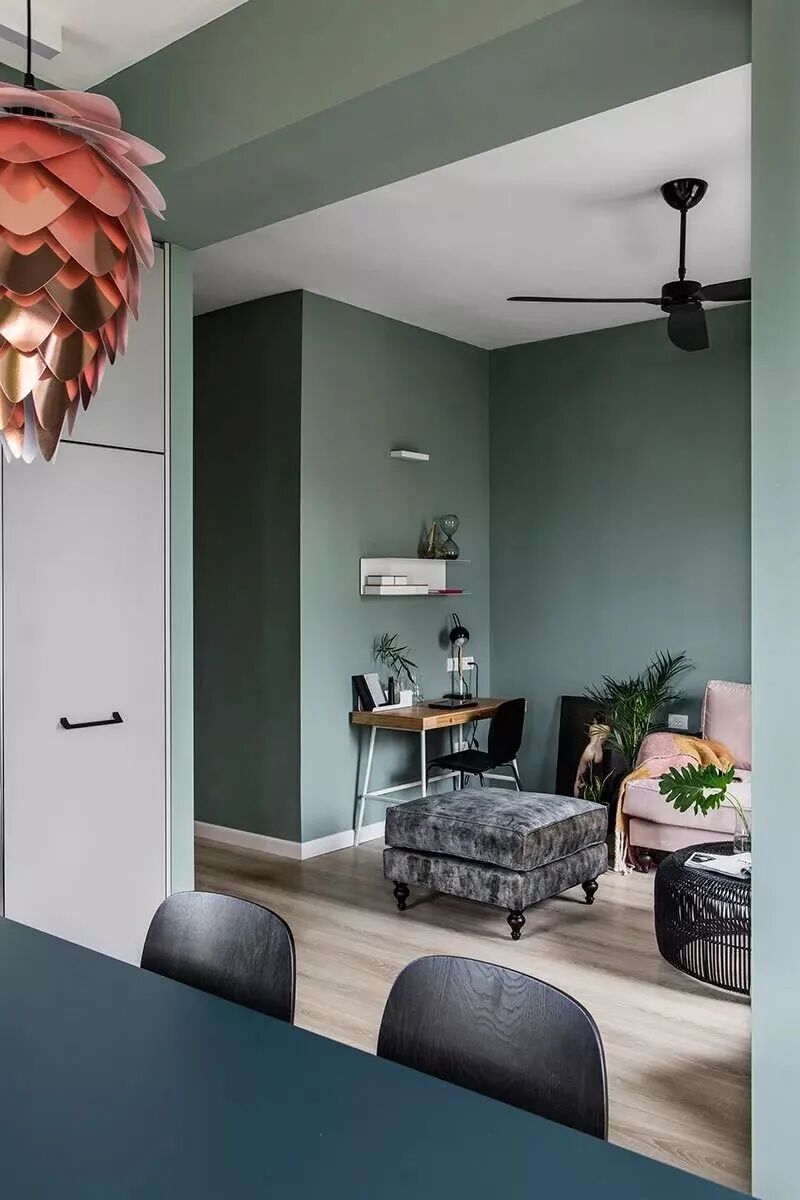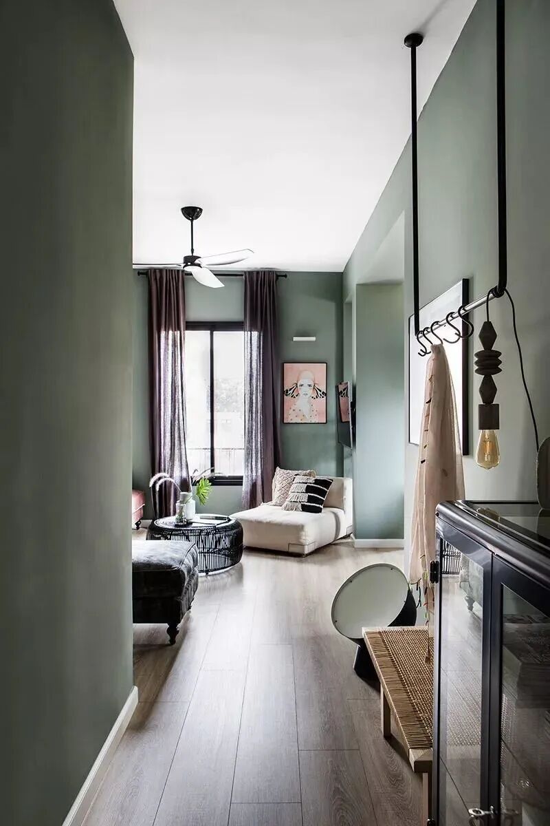 这间现代化公寓为例,我们可以看到墙壁上精心挑选的绿色色调看起来非常清新而高级。就其本身而言,色彩已经在一个房间中创造出了一种情绪,只有通过添加焦点,就能获得一处美妙的生活空间。而浅灰色地板的纳入更是为整个空间加分不少,治愈感油然而生!