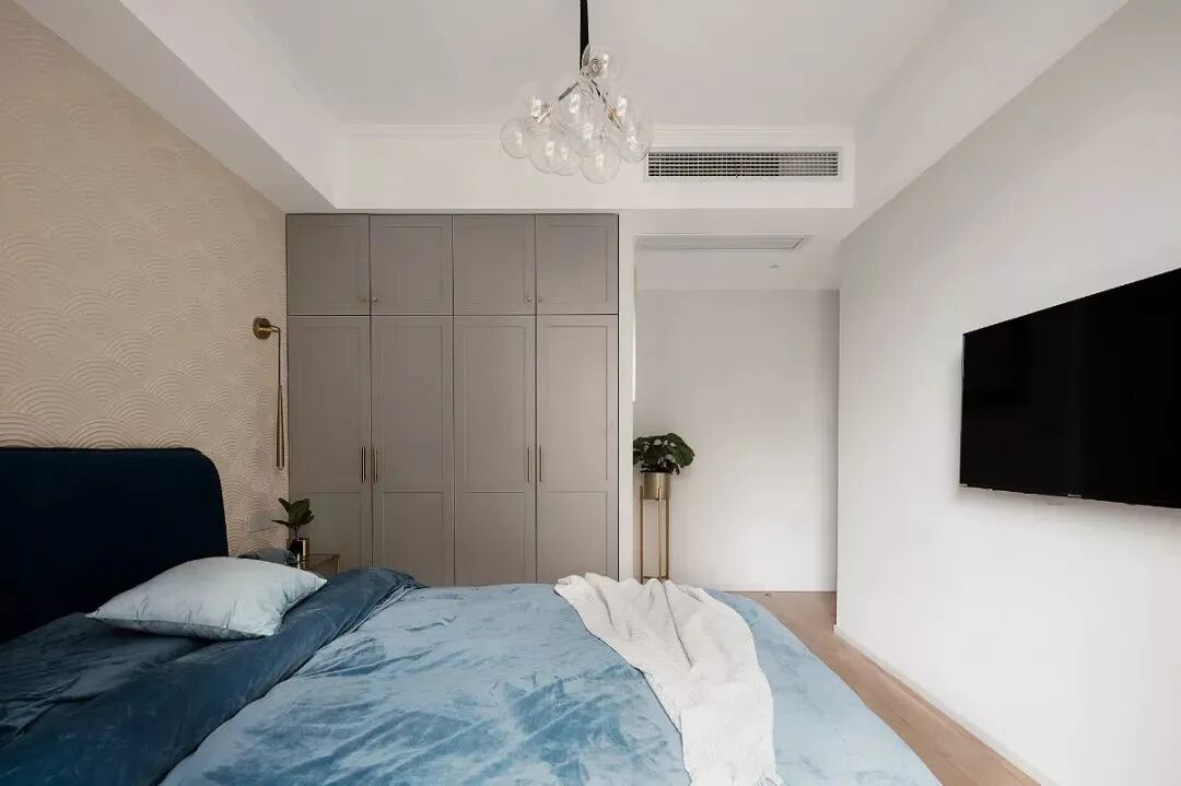 ▲侧边的灰色定制衣柜,卧室门上的吊顶装着中央空调内机,让卧室保持简洁的空间,床尾墙简洁的墙面基础还壁挂安装上电视机,整体空间显得舒适而精致大气。