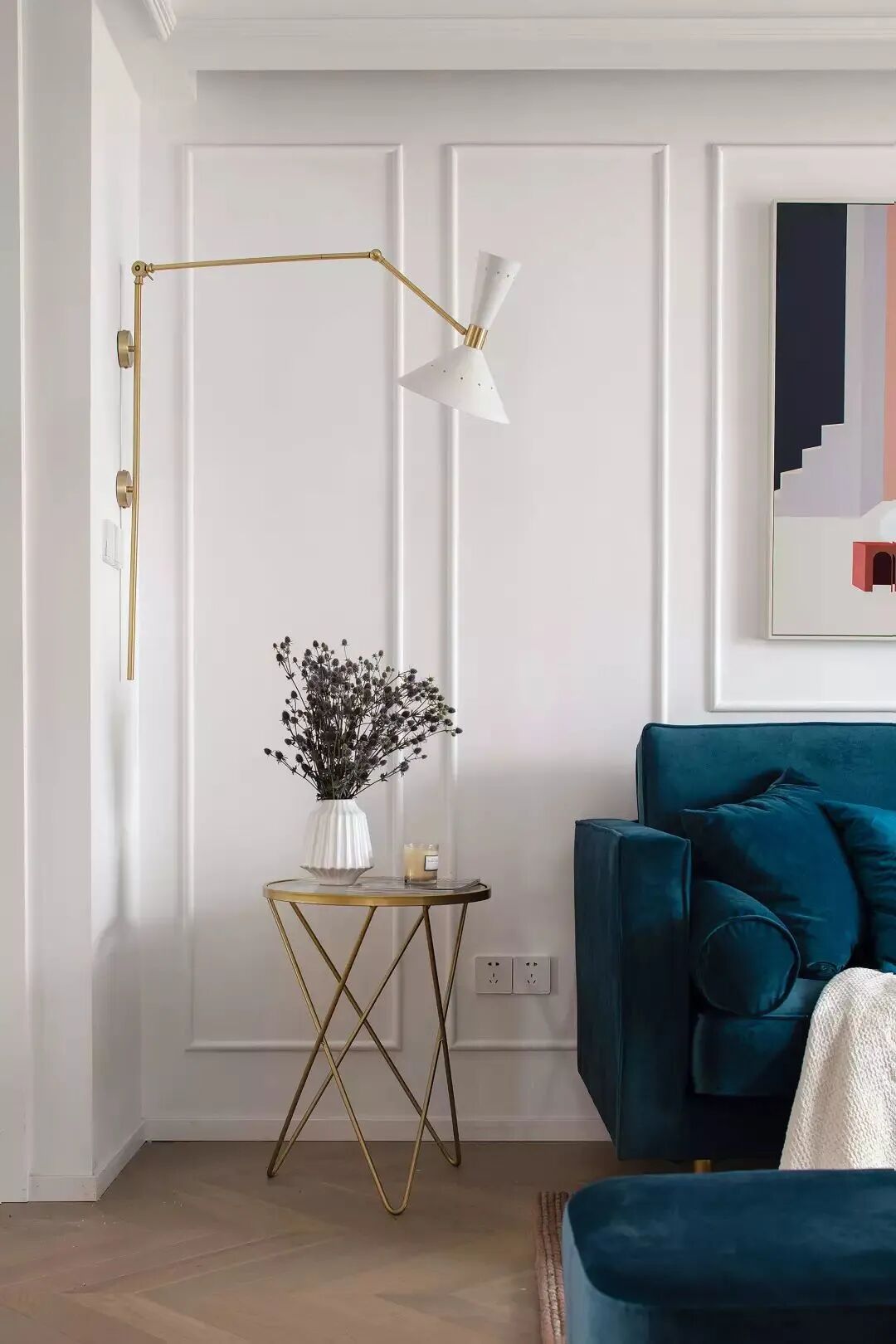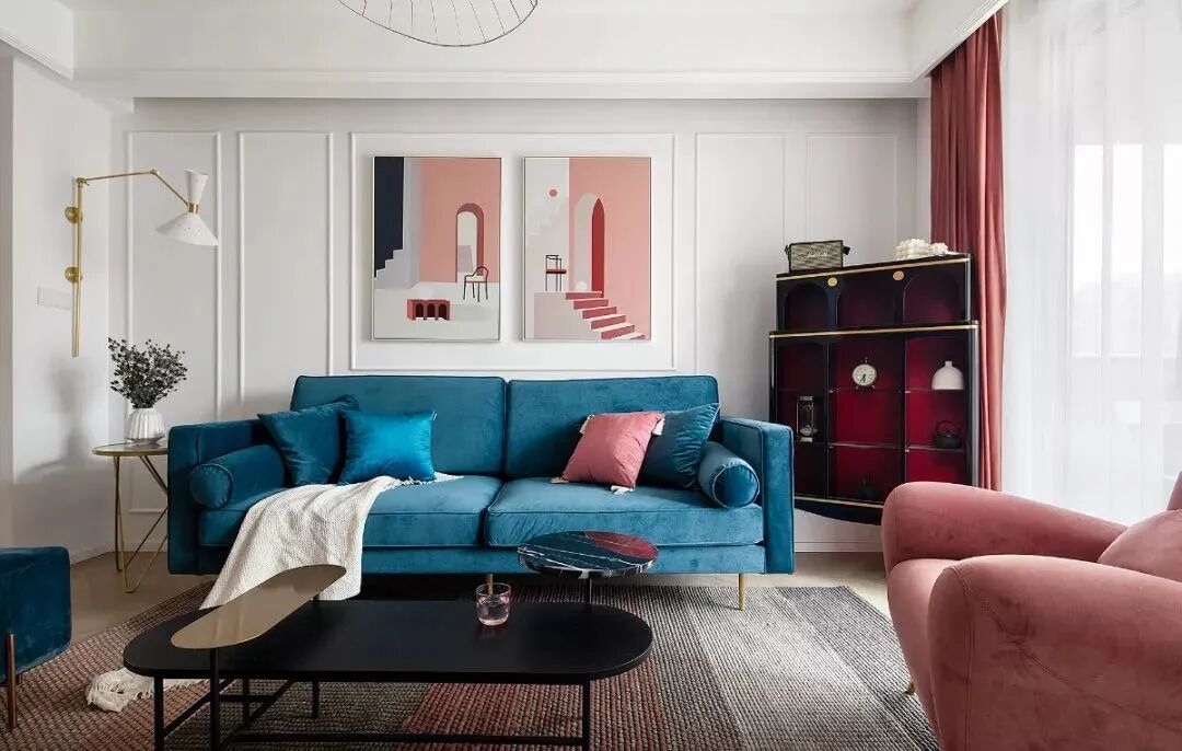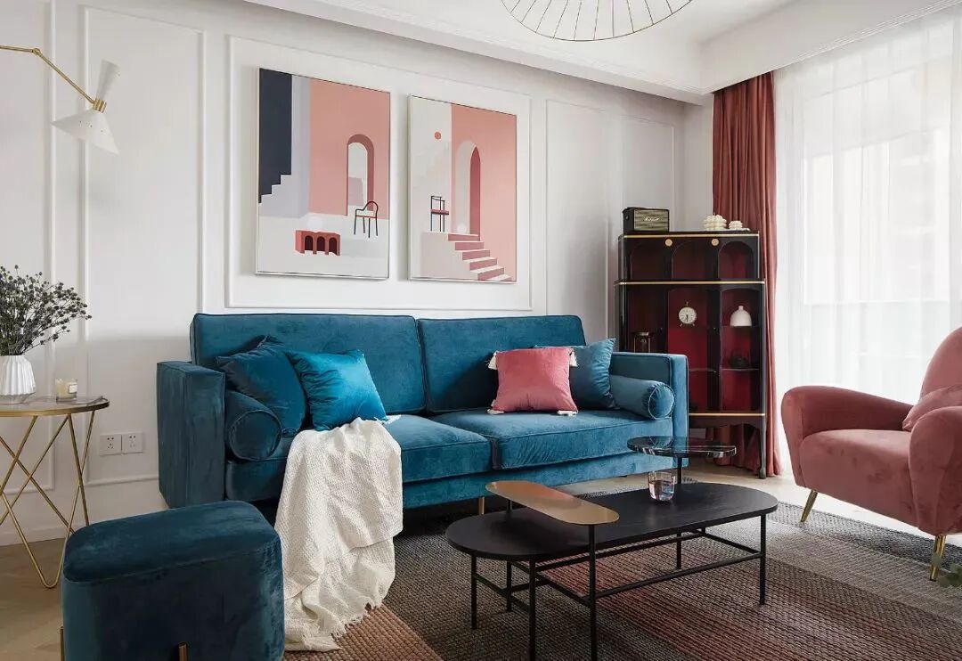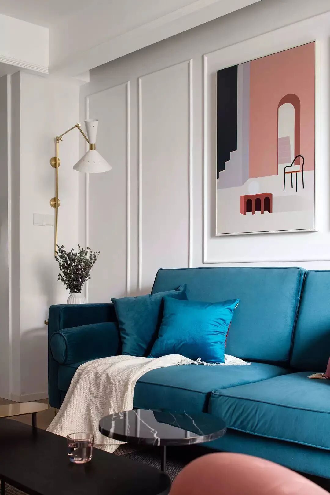 ▲沙发墙在简洁的边框造型线条基础,布置一张蓝色布艺沙发,挂上两幅粉色调的建筑风装饰画,结合角落的一个小斗柜,带来的是浪漫优雅的浪漫设计感。
