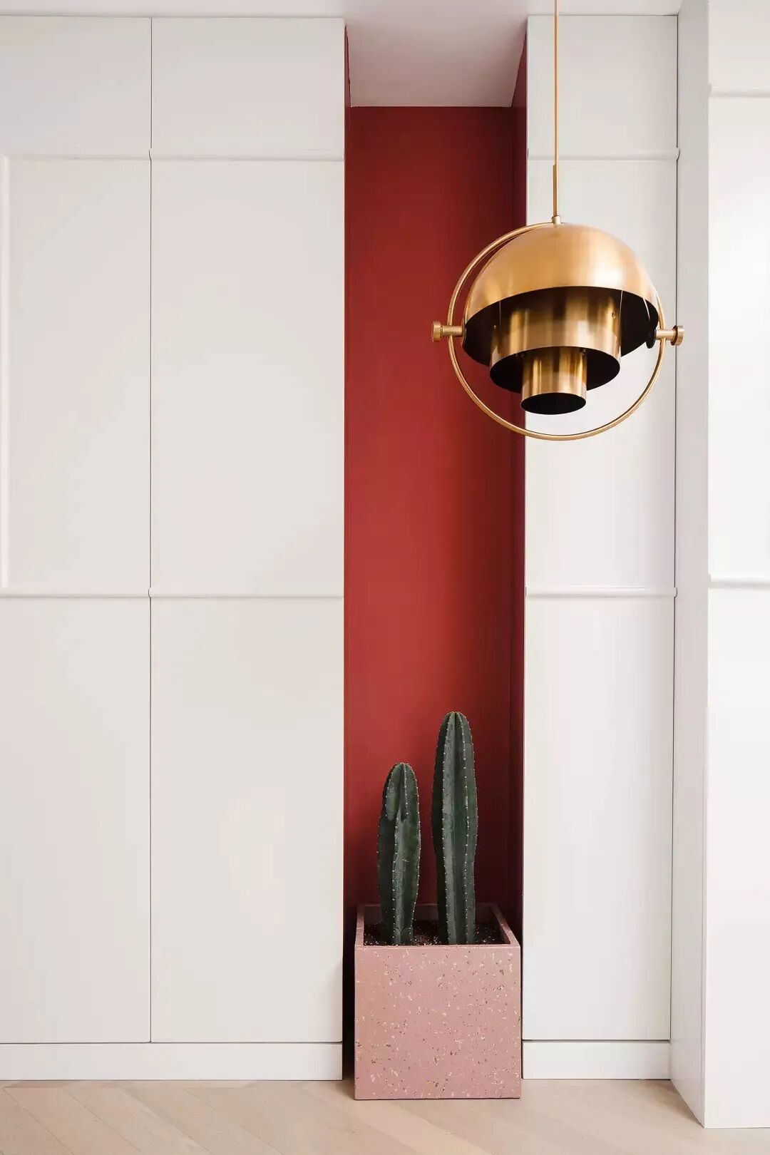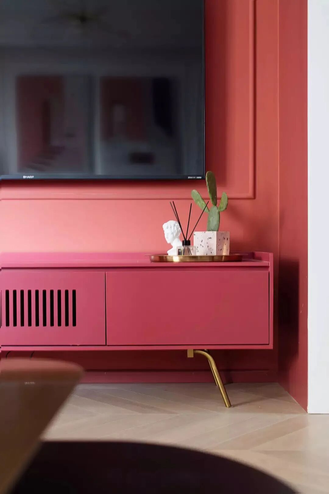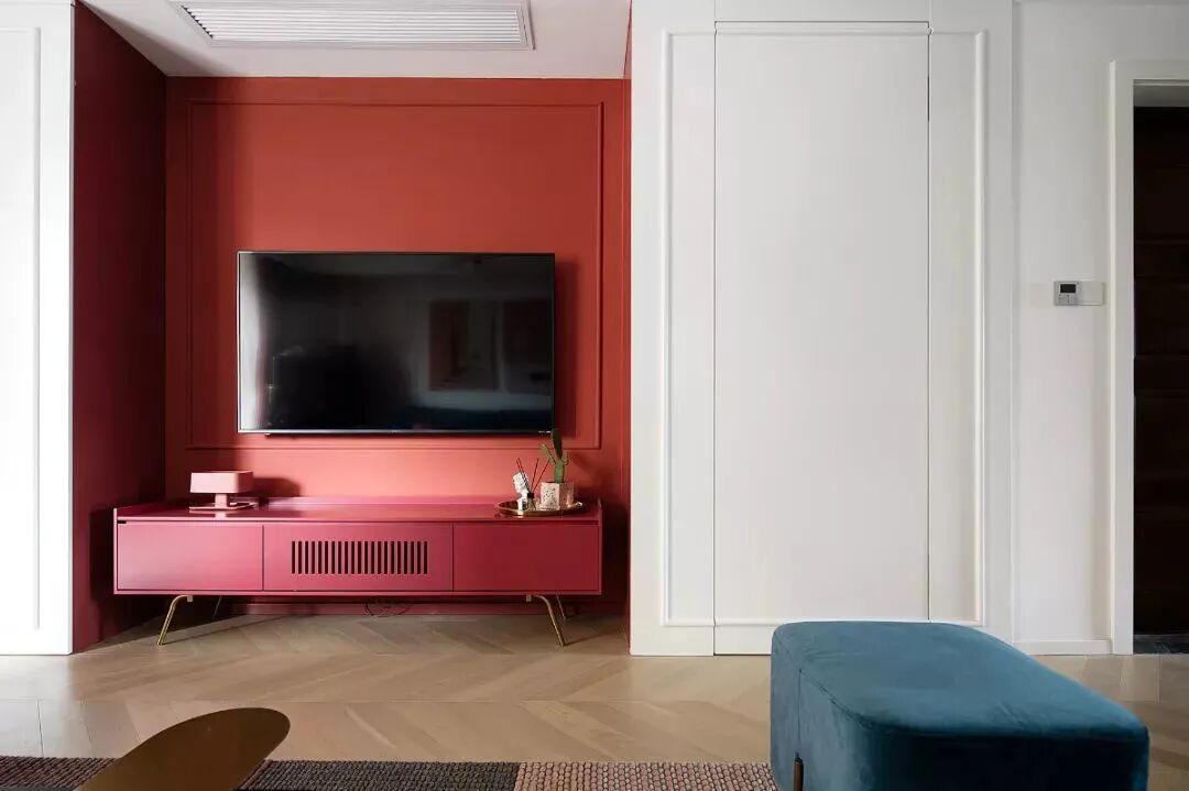▲电视墙两侧是白色的线条边框造型+隐形门设计,中间则是一个嵌入式的电视柜摆放电视柜位置,以红色的设计,带来一种独特优雅的时尚视觉感。