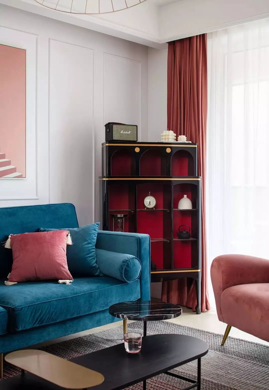 ▲客厅在现代优雅的空间基础,在电视墙、电视柜、窗帘与单人沙发与抱枕处加入了大胆的粉色与粉红色,结合冷静优雅的蓝色布艺沙发与小凳,让客厅显得充满了静雅端庄的时尚设计感。