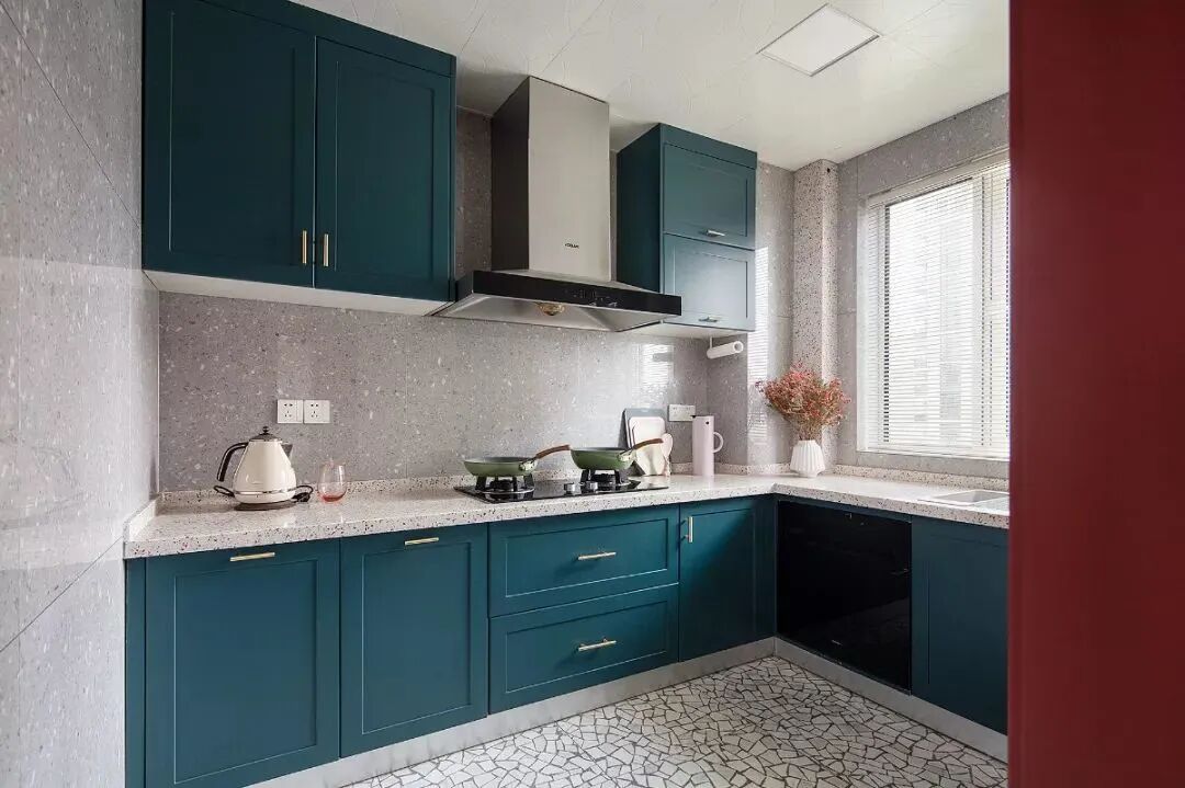 ▲厨房在裂纹地砖基础,搭配水磨石效果的墙面,蓝色的定制橱柜,在L形的操作台布局下,带来一种端庄优雅的烹饪体验感。