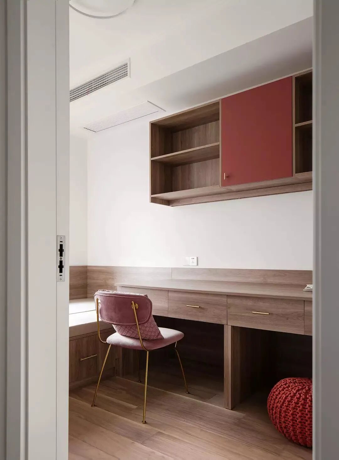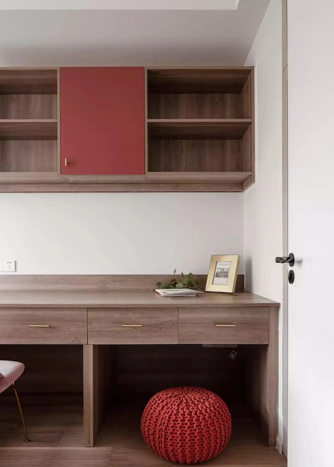 ▲书房以木色的定制书桌+榻榻米,搭配墨粉色布艺椅,吊柜还加入了一面红色的柜门,整体空间自然实用又舒适。