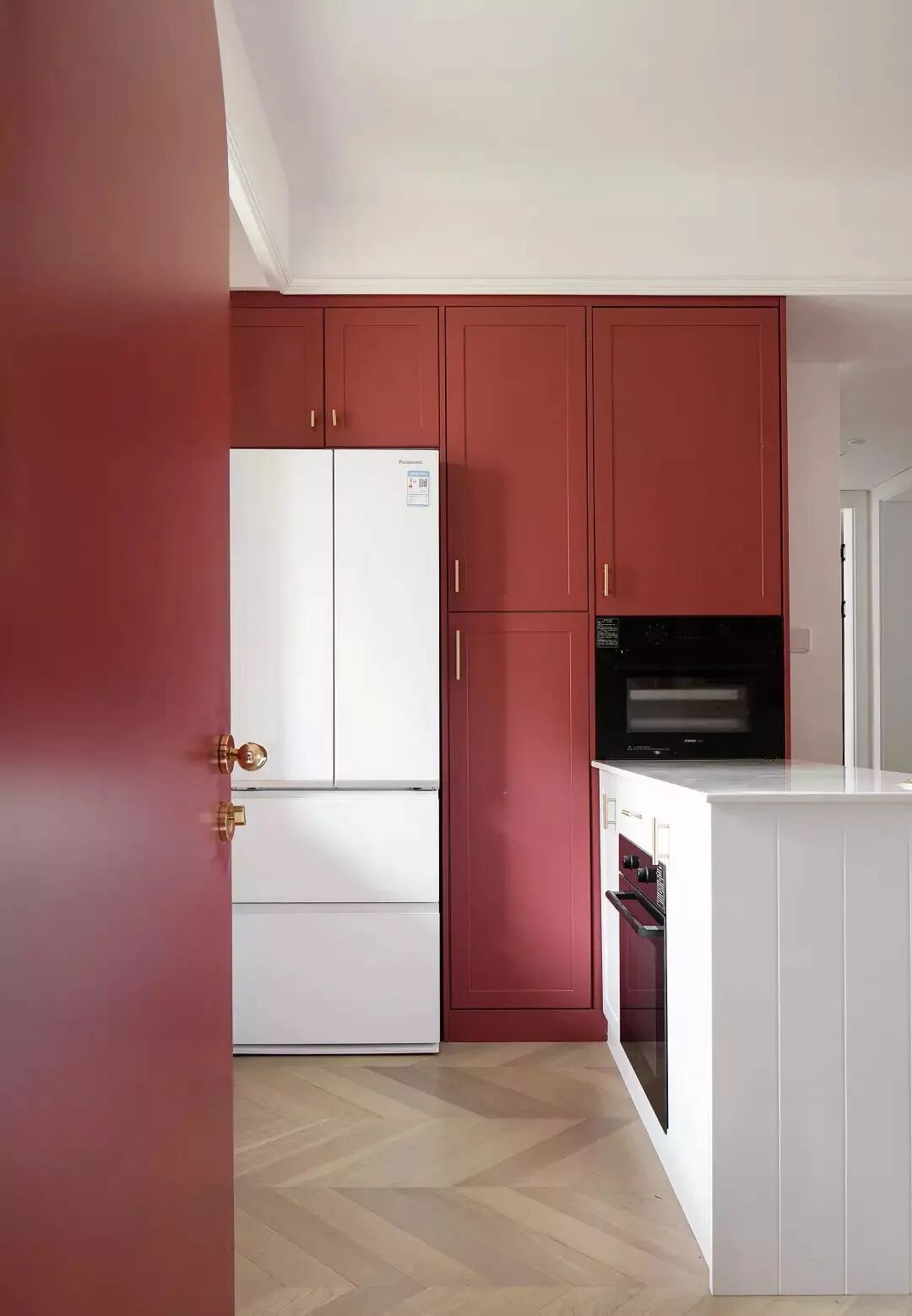 ▲西厨区域里的中岛台与深粉色定制柜,提供了一个时尚实用的西餐料理空间。