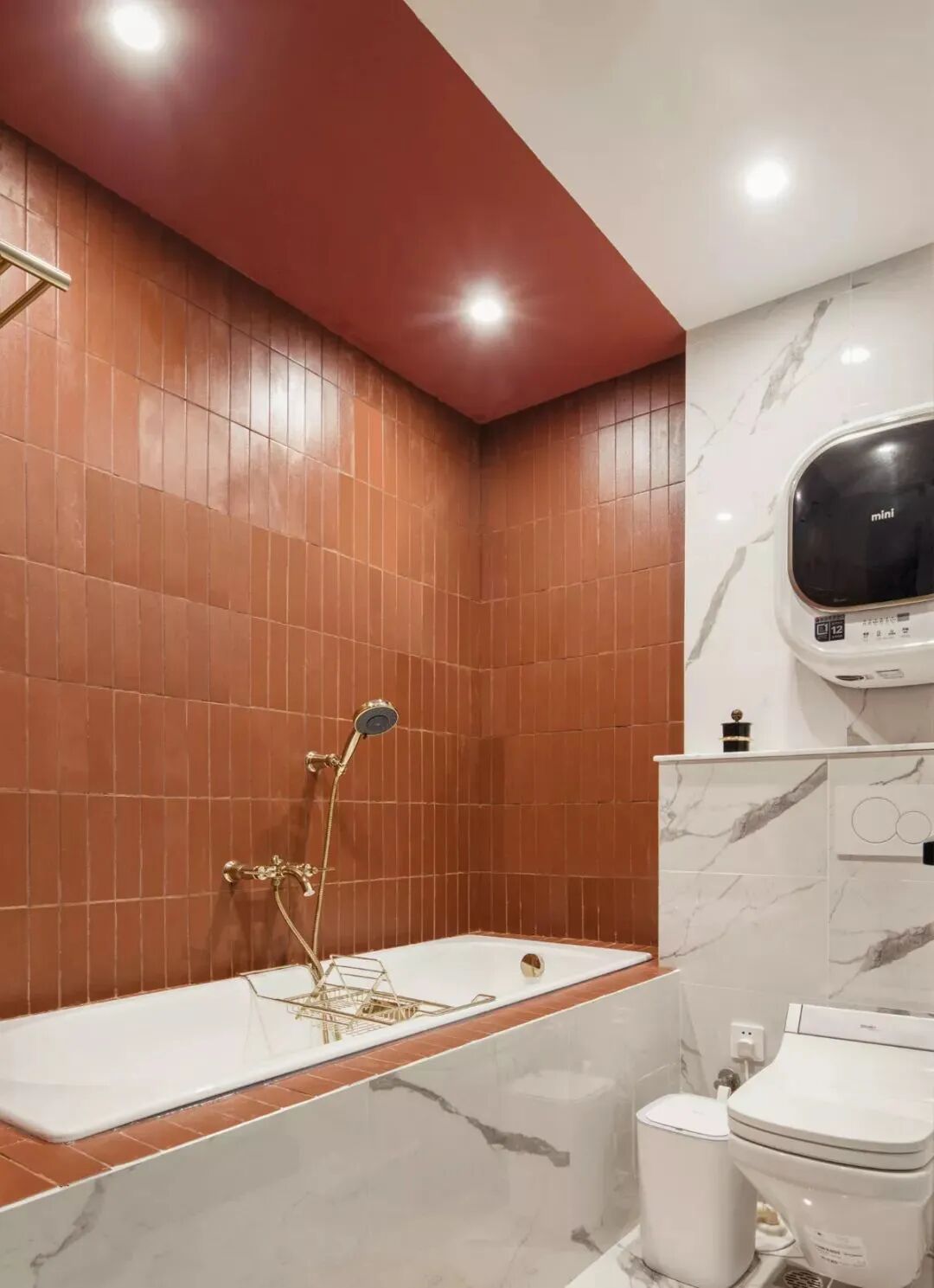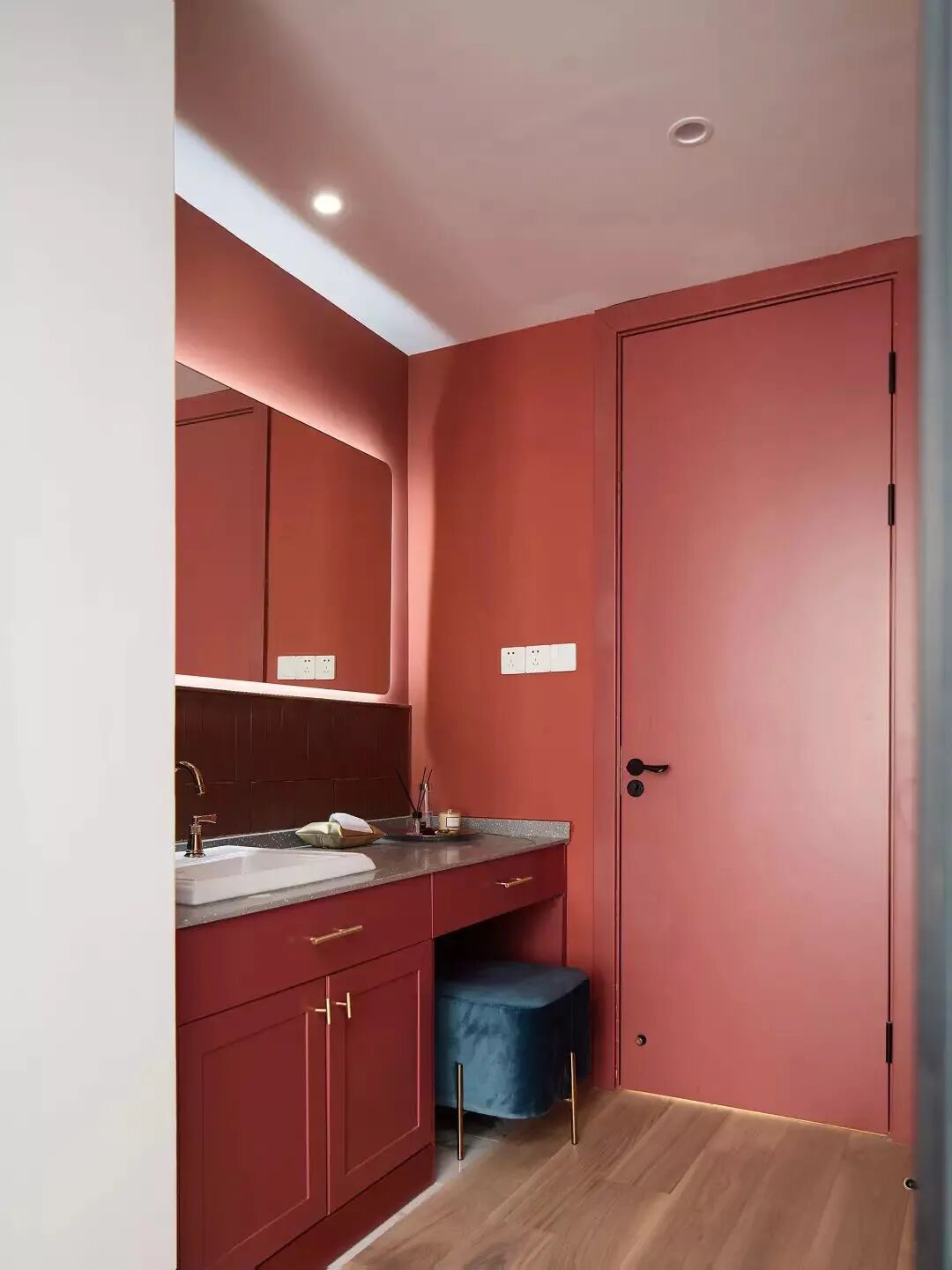 ▲主人卫生间较为宽敞,在洗手盆旁边还留了一个梳妆台,整个空间都以红色的氛围,梳妆台下布置一张蓝色化妆椅,在热情中点缀出一种安静优雅的气质感。
