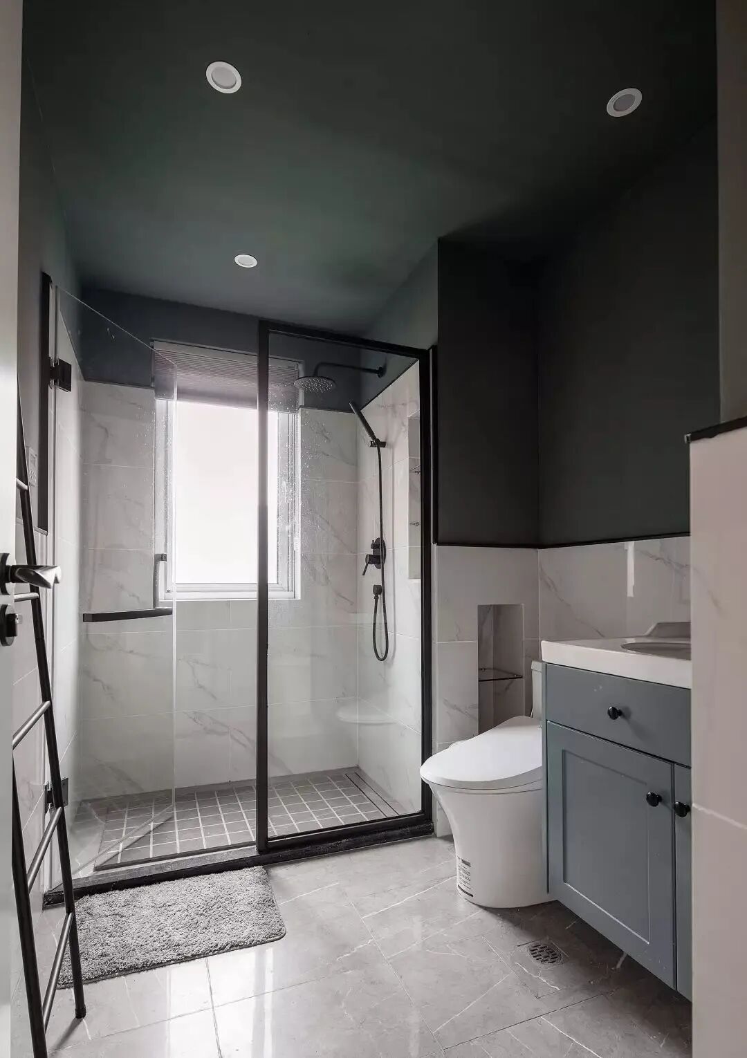▲次卫灰色地面基础,搭配雅白的墙面,绿深色的墙身与天花,还有黑色的淋浴边框与五金件搭配,让空间显得现代优雅而华丽档次。
