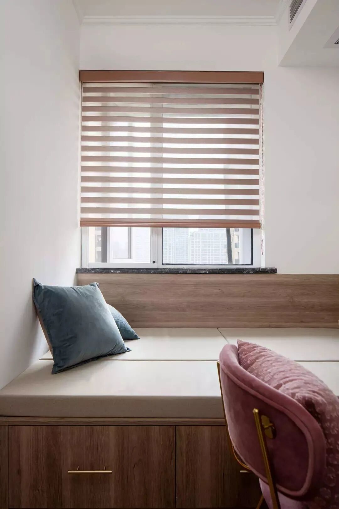 ▲榻榻米床上垫着舒适的软垫,窗帘则是以木色的百叶帘布置,呈现出一种温情优雅的空间氛围感。