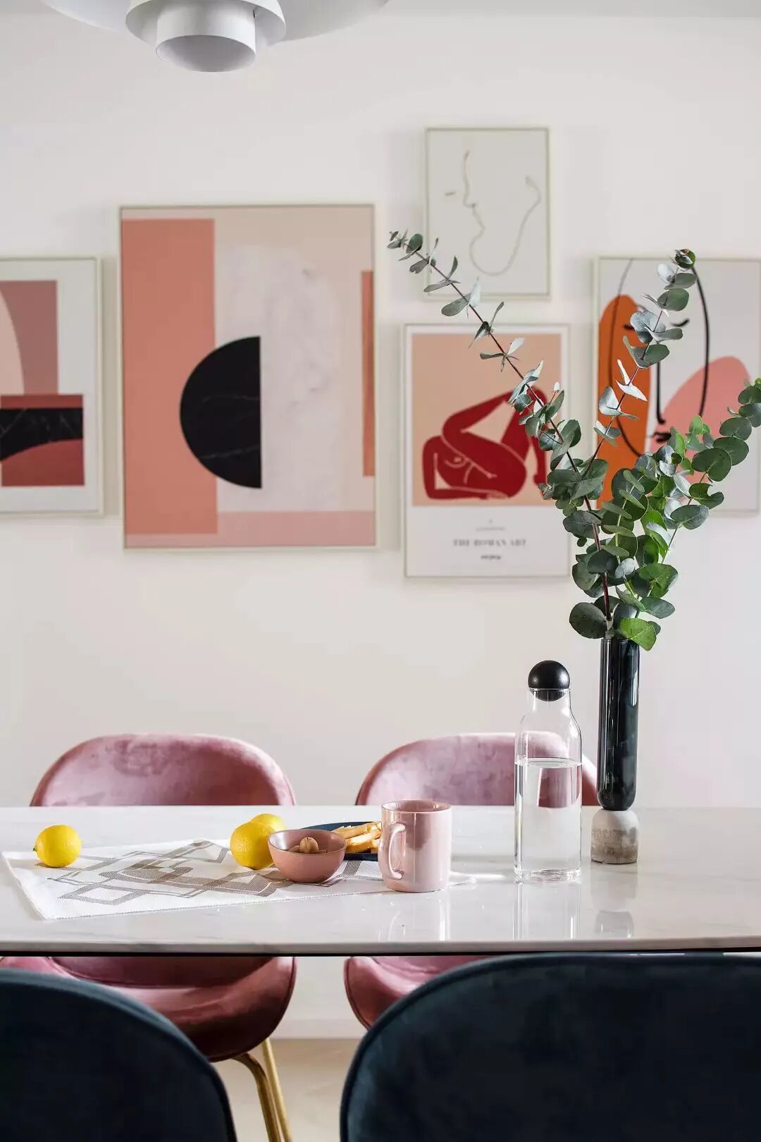 ▲餐厅墙面的粉色主调装饰画,还有另一侧的定制柜中间留空出一个红色空格摆一盆仙人掌绿植,餐桌上的茶杯与花瓶布置,让空间充满浪漫优雅的华丽档次。