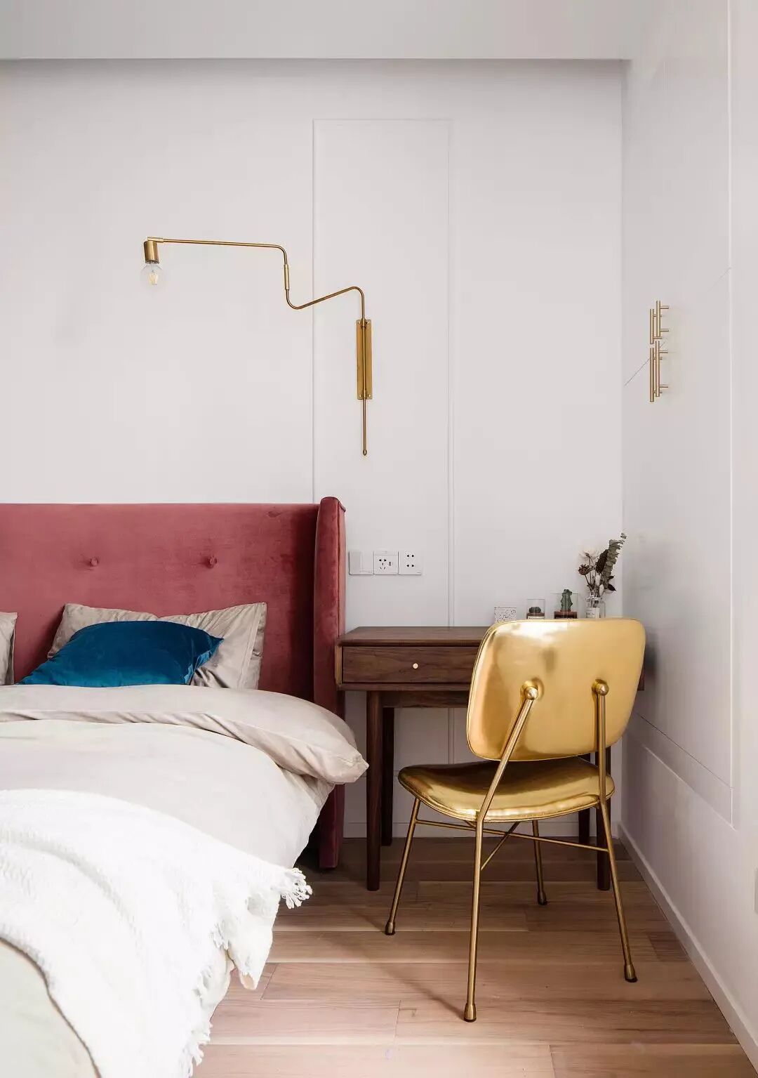 ▲两侧床头灯的金属质感设计,梳妆台还搭配了一张金色的椅子,让空间显得时尚而又华丽精致。