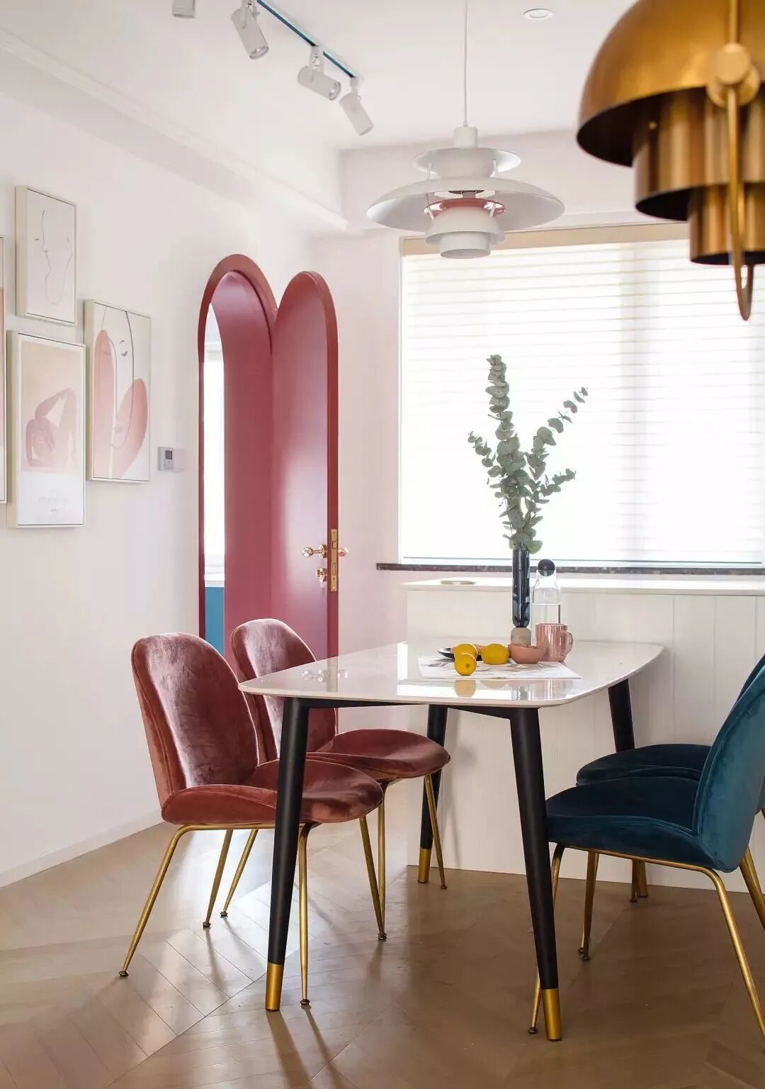▲餐厅空间也是比较时尚优雅,旁边的粉色拱形厨房门特别抢眼,布置一张大理石台面的餐桌,还有红蓝配的布艺餐椅布置,餐桌椅的脚上金属质感装饰,都让空间显得格外的华丽精致。