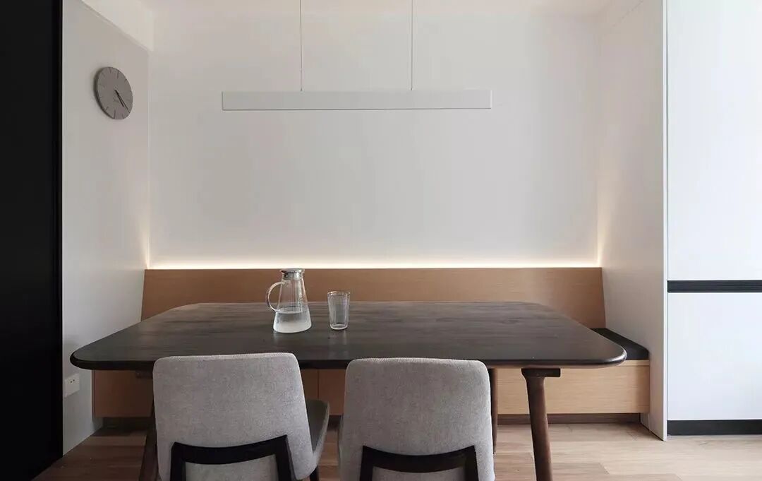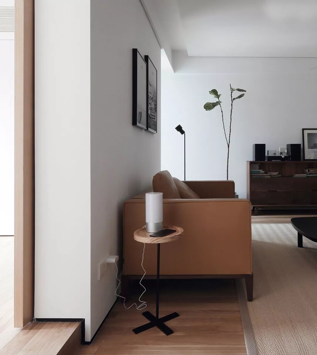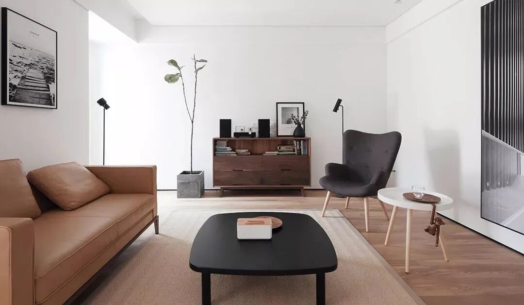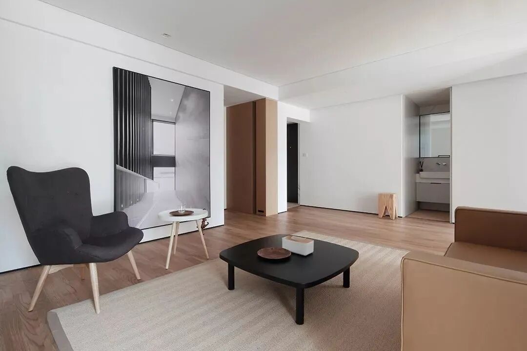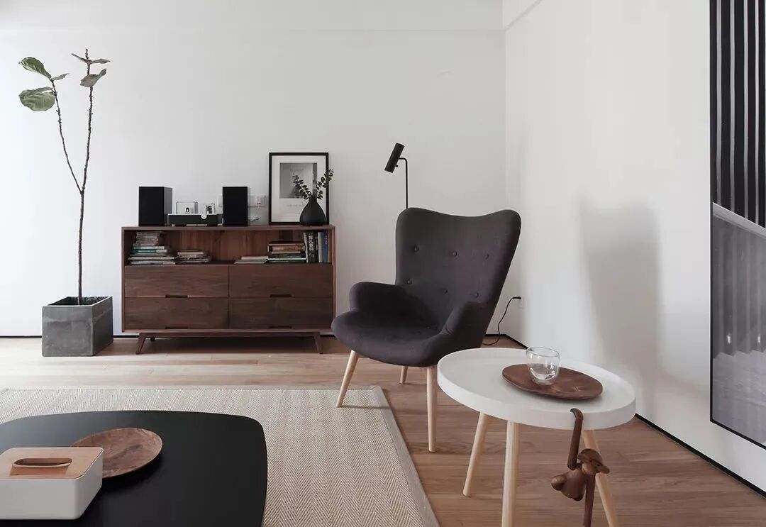 以极简的方式打造了一个简约大气的家,原木黄的地板、复古的木柜,姜黄的沙发都让客厅洋溢着一股原木的自然清香。黑色的矮脚茶几搭配黑色木脚沙发椅,与米色的毛绒地毯和白色的三脚茶几形成对比,结合洁白的墙面空间,黑白色调的反差,营造出一种大气沉稳之感。