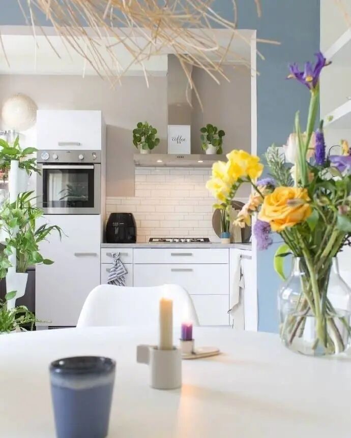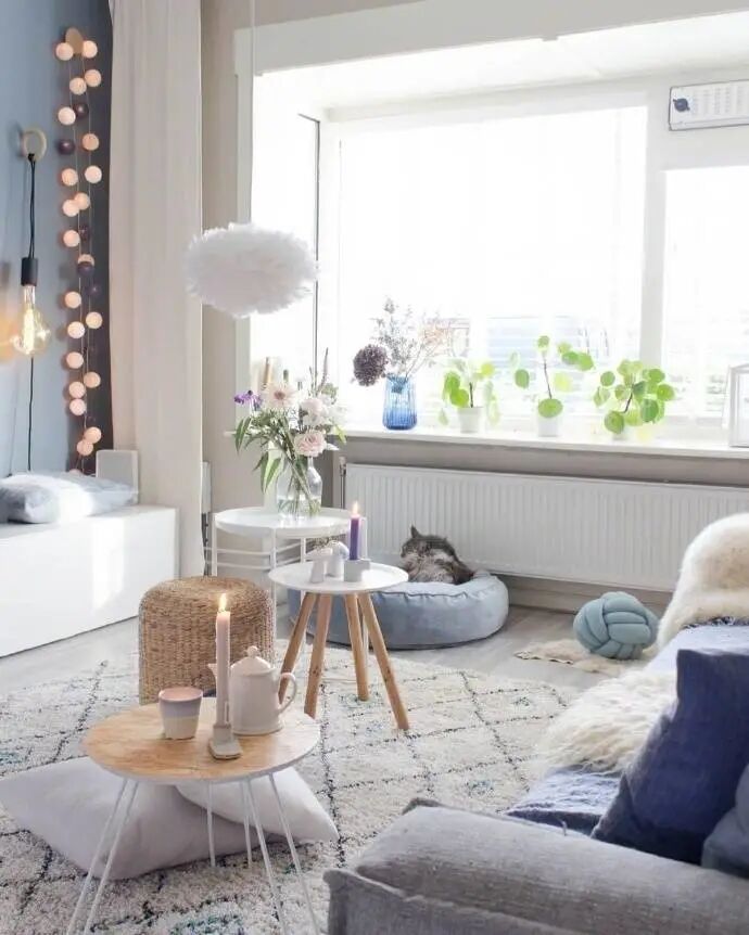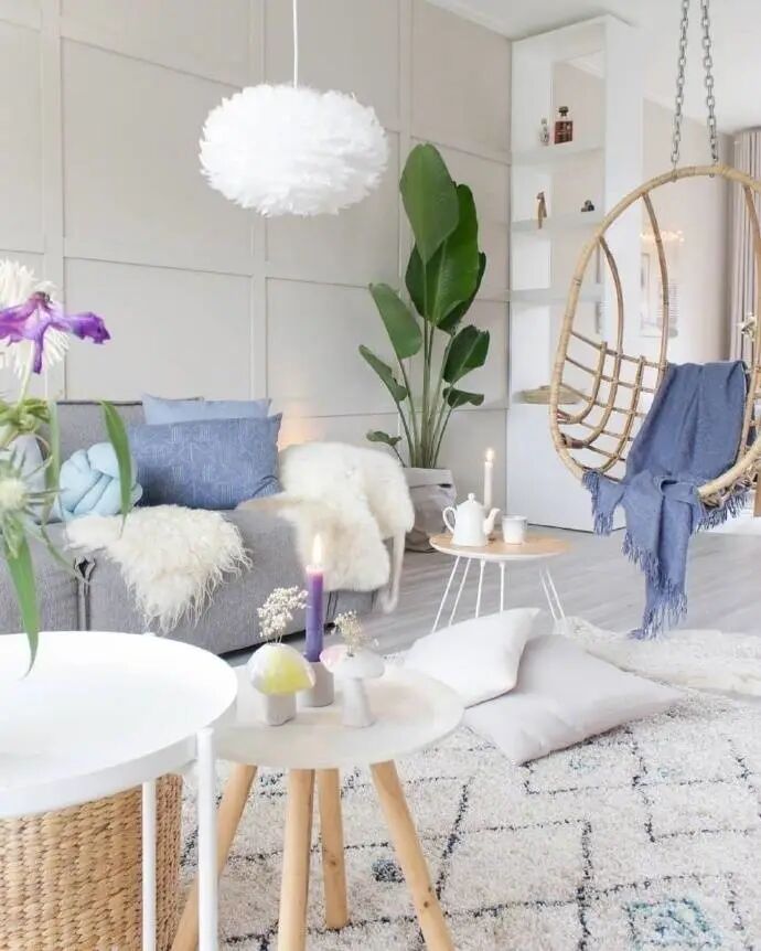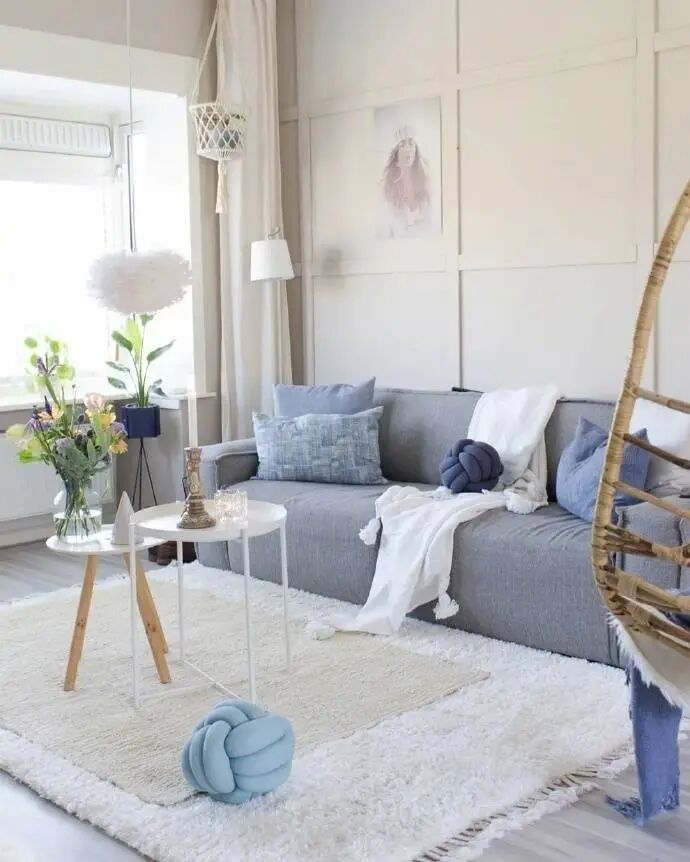如果我有一套只属于自己的房子,我想它的装修就是这套房子的样子,蓝白的色调,小清新的属性,温柔的特质,它没有杂志大片里的清冷高远,却有人间烟火的浪漫舒适。 低饱和度的灰色调木质地板,给这个家定下了柔和的基调,或蓝或米色系的墙面,蓝灰色的沙发,配上同色系的长毛地毯,云朵状的吊灯,温柔、柔软的气息就这么扑面而来。茶几上的杯子,几盆绿植,几处插花……生活似乎就应该这样积极向上又从容淡定。
