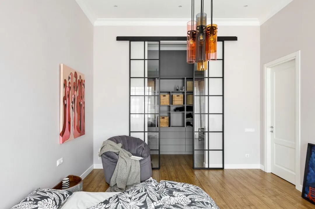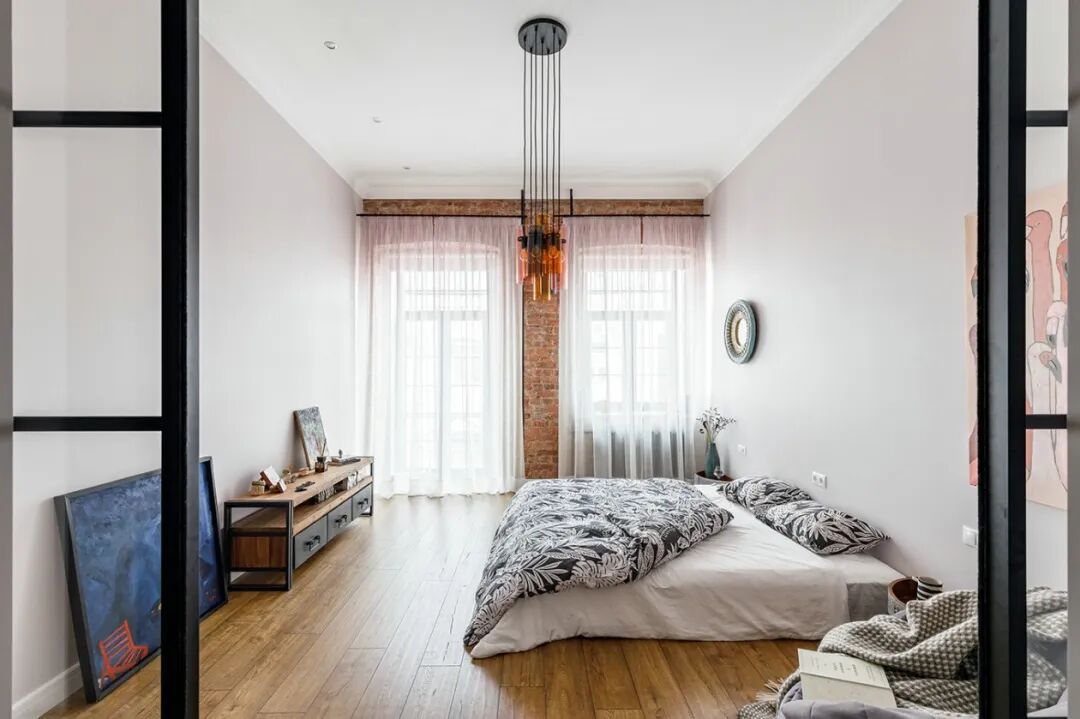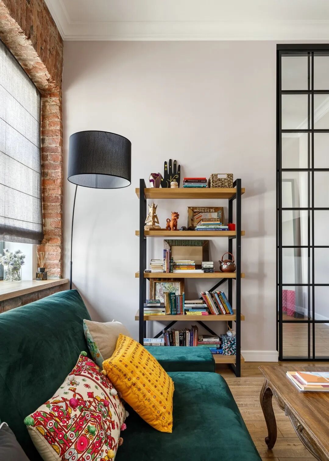 一面红砖墙让七、八十年代工业时代的粗粝扑面而来,时光的斑驳之感油然而生。一半大白墙嵌着横平竖直的现代橱柜、厨电,工业的颗粒感和现代的科技感在这里碰撞。 墨绿色沙发、明黄的抱枕,连几何形状的餐厅灯都有着或红或紫的跃动,工业元素遇上了色彩。 一款复古款的木地板串联起客厅、餐厅和卧室的气质,彰显着粗中有细的气质美学。