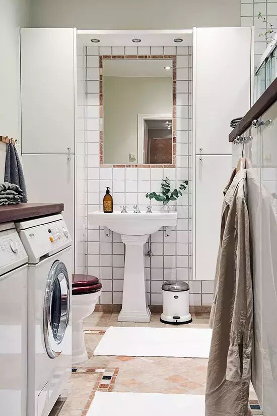卫浴室铺上小方瓷砖,洗手台两边的收纳柜呈现对称的美感。