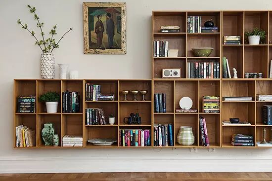 开放式组合书架承包整面白墙,简约整齐,美观大方,左上方留白,用清灵的绿植和简朴的装饰画,补上别样的美感。