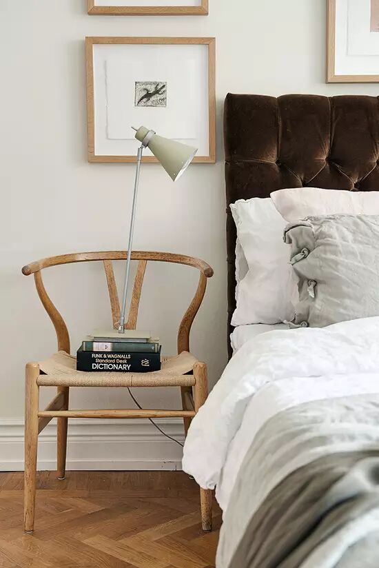 原木椅充当床头柜,木头的清香渗透进睡前的阅读时光。