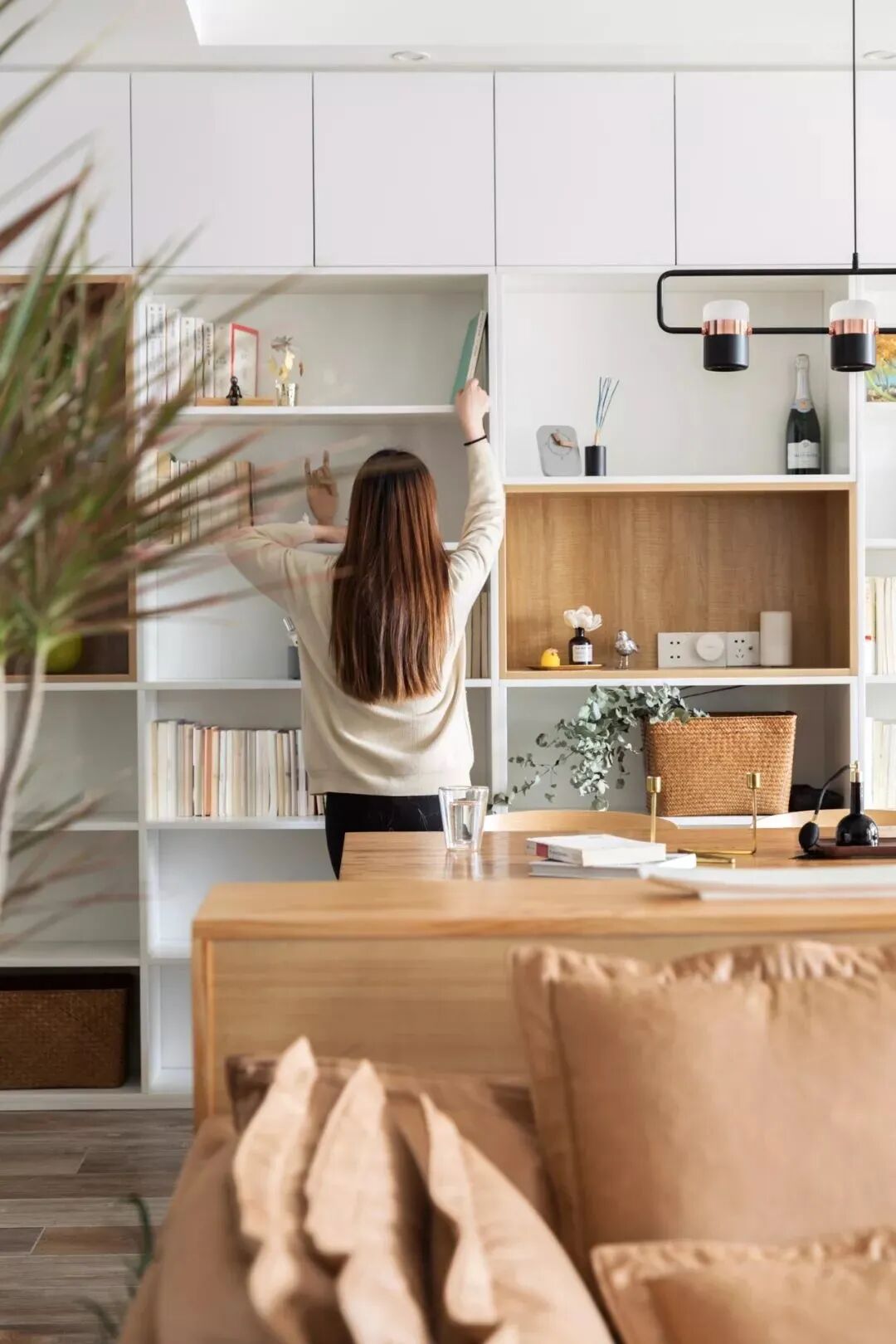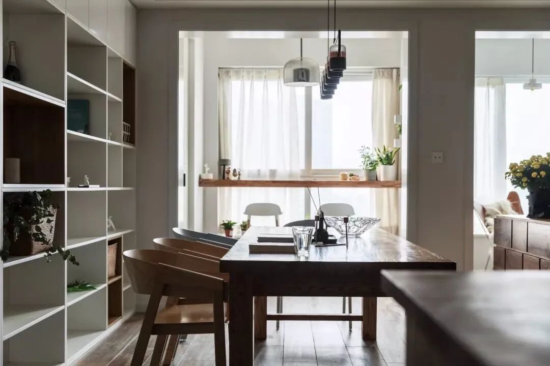 餐边柜兼任着书架、展示架的功能,为客餐厅带来了一个文艺精致的角落与实用的功能。
