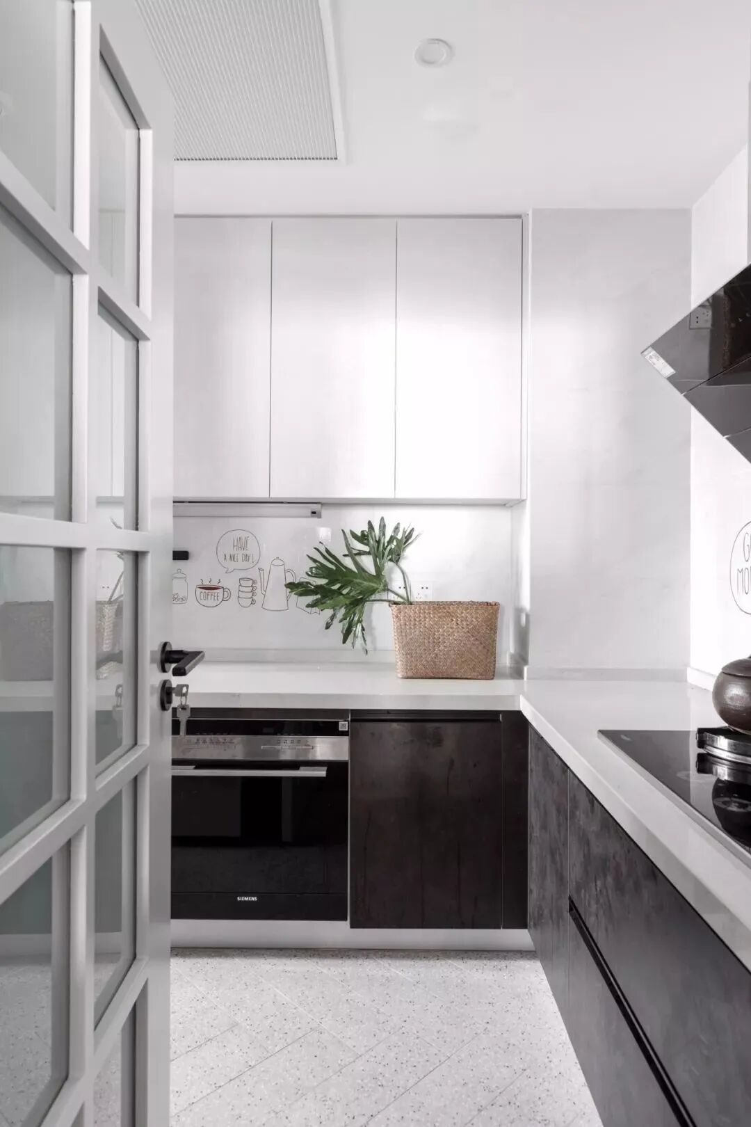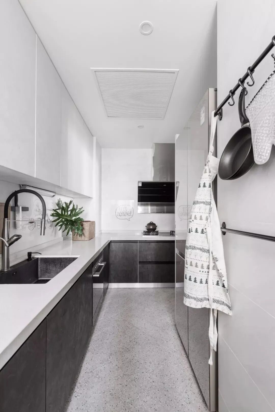 墙面的黑色挂杆架,挂上锅具、手套与围裙,让厨具也有着轻松自然的烹饪体验。