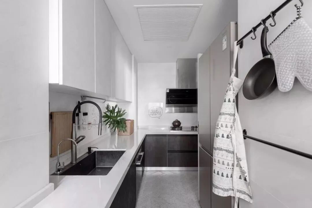 厨房整体现代轻奢的灰色调空间,让做饭的空间也轻松年轻自然,L型的操作台,也是使得做饭的空间更加实用方面。