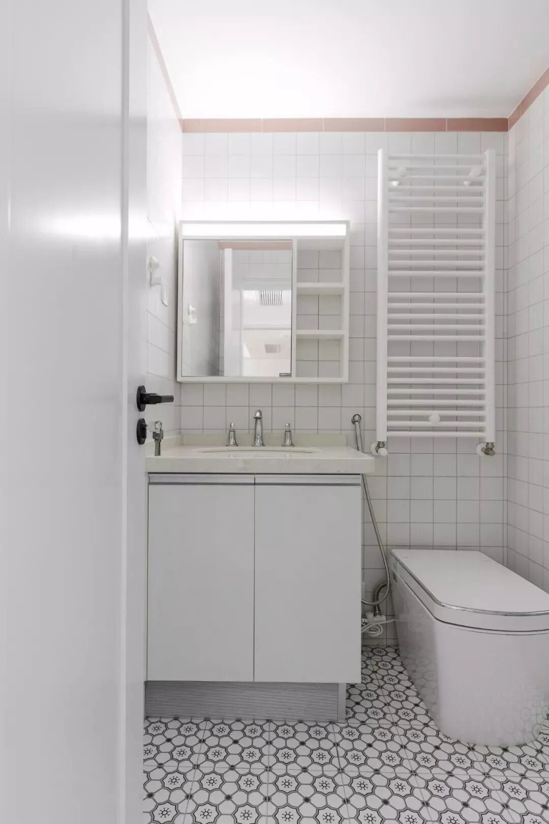 主人卫生间的地面是黑白色调的花砖,结合白色的墙面小砖,整体洁白的卫浴洁具,洗手盆前面的浴镜柜留出了一排的开放格架,让洗漱用品可以方便地存放上去。