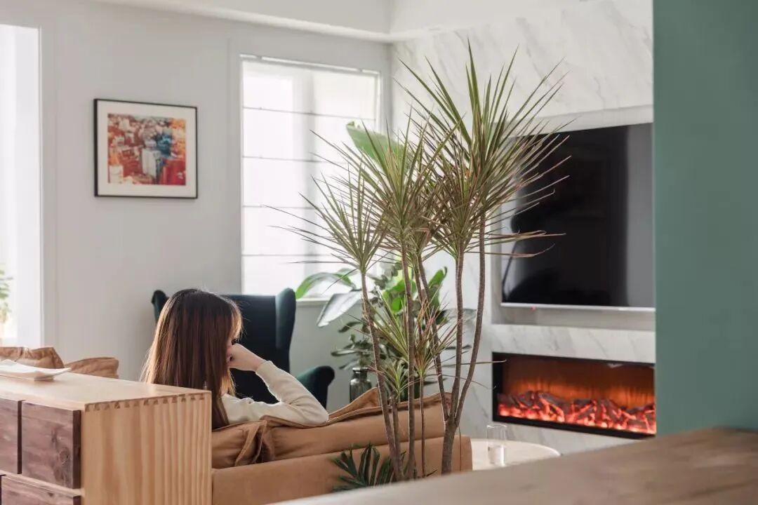 大理石质感的电视墙,嵌入式的电视柜机壁炉造型,旁边还有一盆的芭蕉叶绿植,整个空间充满了时尚清新的气质。